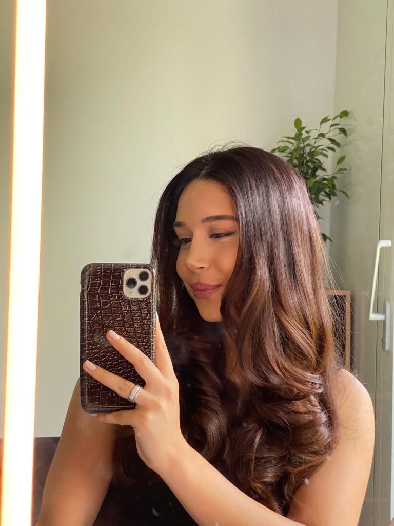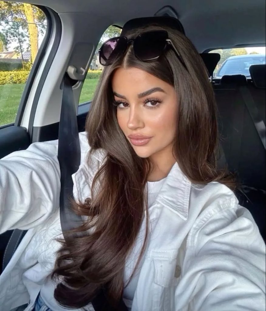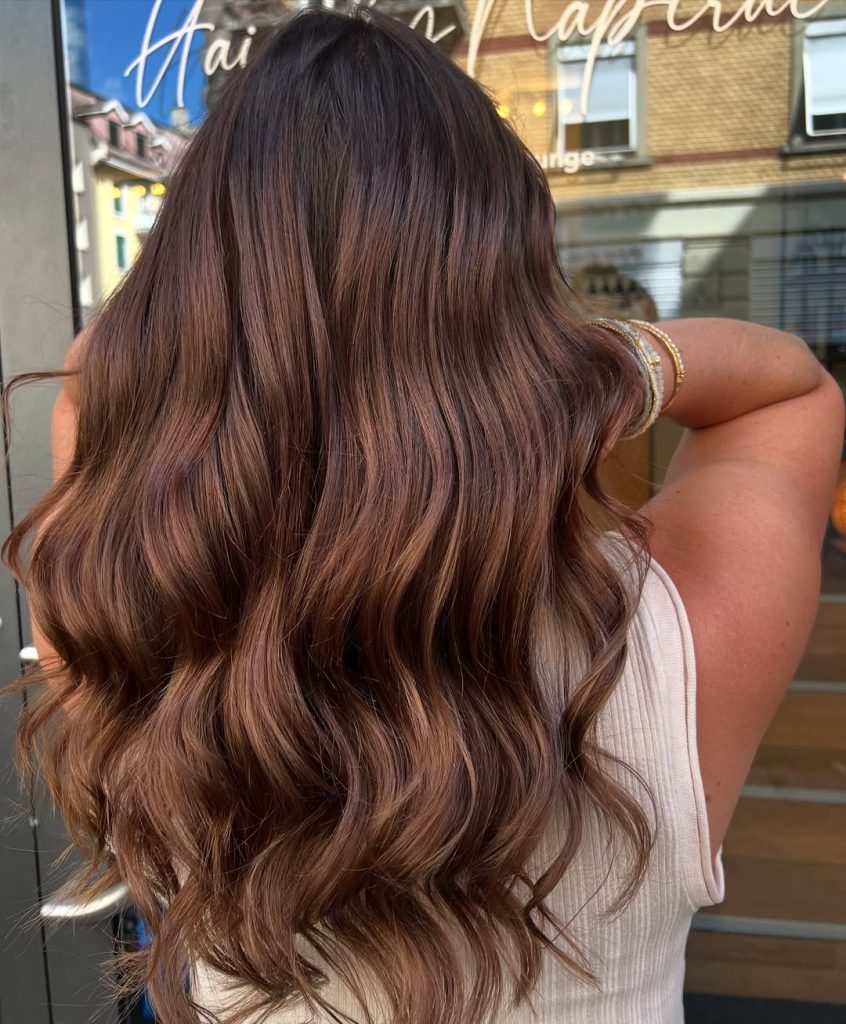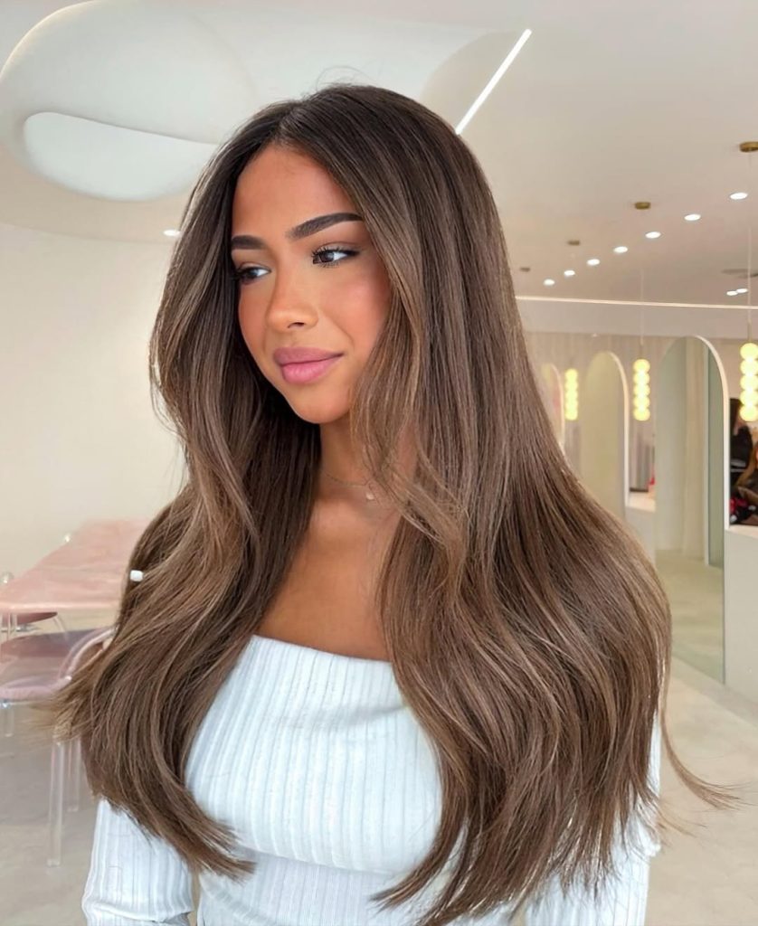 Glossy, waist-grazing layers in a silky dark brown hue create a look that radiates confidence and sophistication. It’s the kind of style that feels luxurious, like your hair is your best accessory. The long, flowing strands have that timeless appeal, giving off the same vibe as classic Hollywood hair with a modern twist. If you naturally have straight or light waves in your hair, this style is going to look stunning on you.