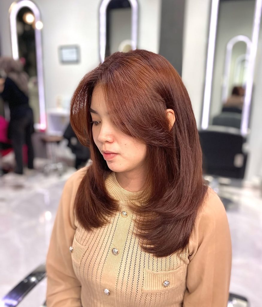 This style is most effective on medium-density long hair. The layers allow for natural movement, while the chestnut color lightens up the overall look. To maintain it, a weekly hydrating mask can be used to keep it shiny and soft.