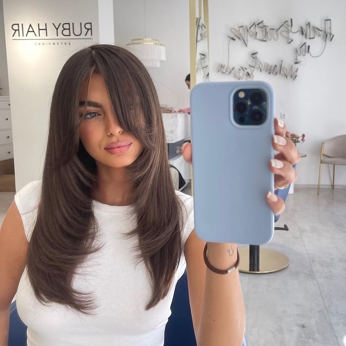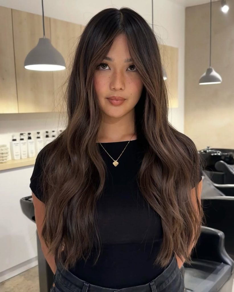 There’s something magnetic about long dark chocolate layers that immediately brings a touch of timeless elegance. The deep richness of the color frames the face beautifully, while the soft movement of the cut adds a glamorous flow. It’s the kind of hairstyle that makes you feel polished without looking like you’ve tried too hard—perfect for dinner out or just running errands with quiet confidence.