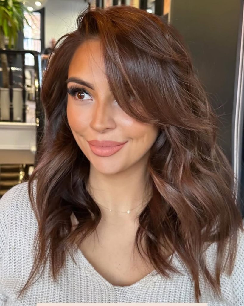 This medium brown hairstyle with a touch of ash base tone emits a sophisticated, contemporary vibe. The tone is deep without being incredibly warm, so it feels versatile as well as chic. With its natural flow and slick waves, it’s the type of hairstyle that feels mature without remaining boring.