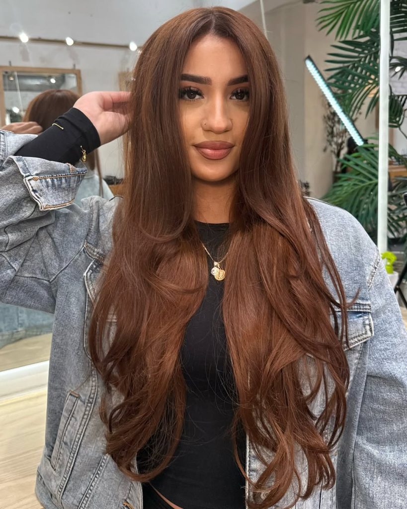 There’s a natural confidence that comes with long, layered hair in a warm caramel-brown shade. It feels bold yet feminine, with a color that strikes a beautiful harmony between depth and brightness. The style is glamorous without being over-the-top, bringing out a healthy, radiant look that pairs perfectly with glowing skin.