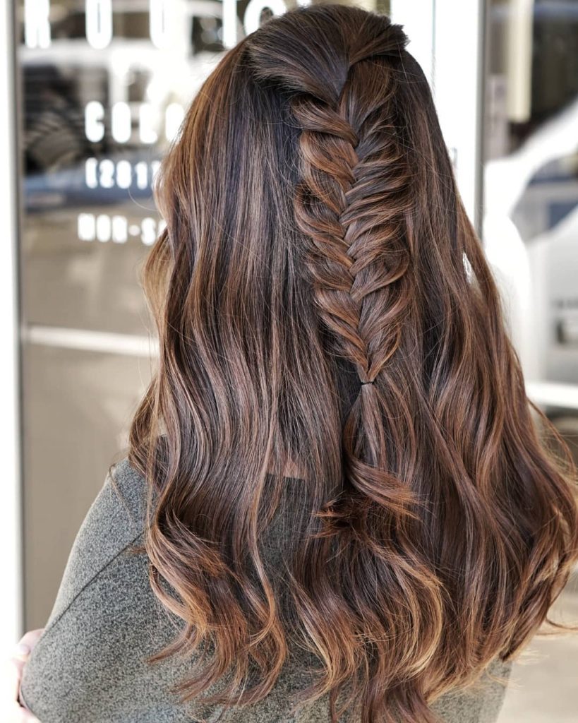 There’s an undeniably romantic charm in soft brown waves paired with a fishtail braid running through the center. The look feels whimsical yet polished, perfect for when you want your hair to be both playful and refined. It gives the impression of effort, even though it comes across as lighthearted and carefree.