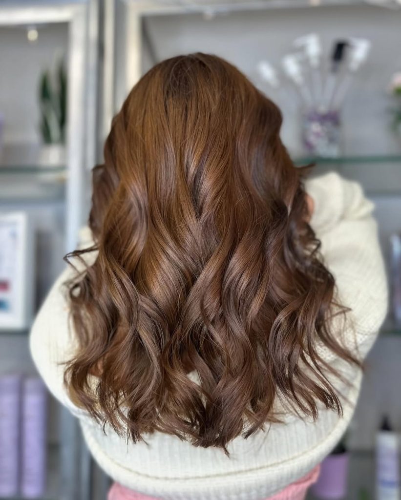 This look is perfect for fine to medium hair since the waves add volume and texture. The chocolate shade complements a wide range of skin tones, and the cut’s length makes it easy to maintain. A curling wand and a touch of heat protectant are all you need to keep the style glossy and polished.