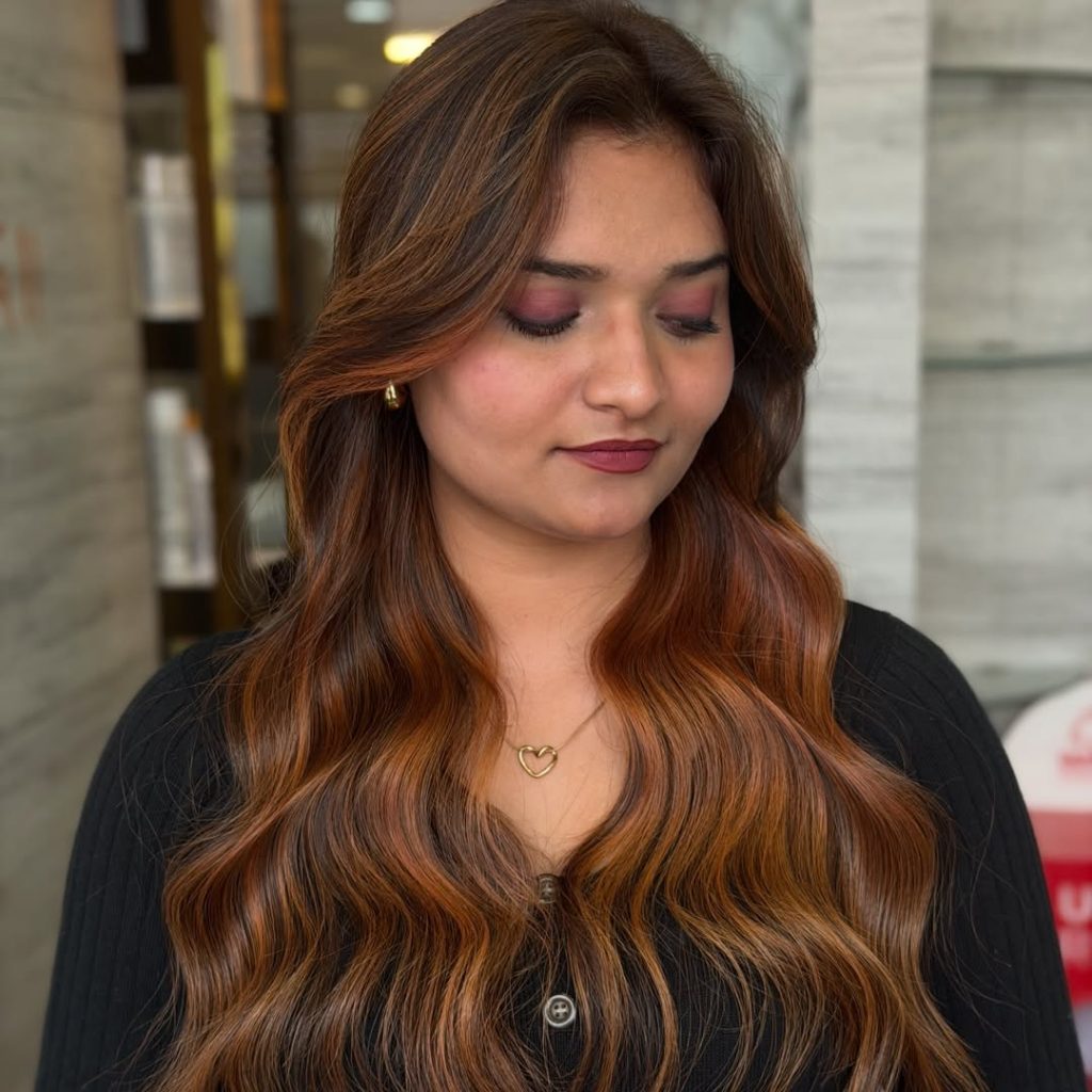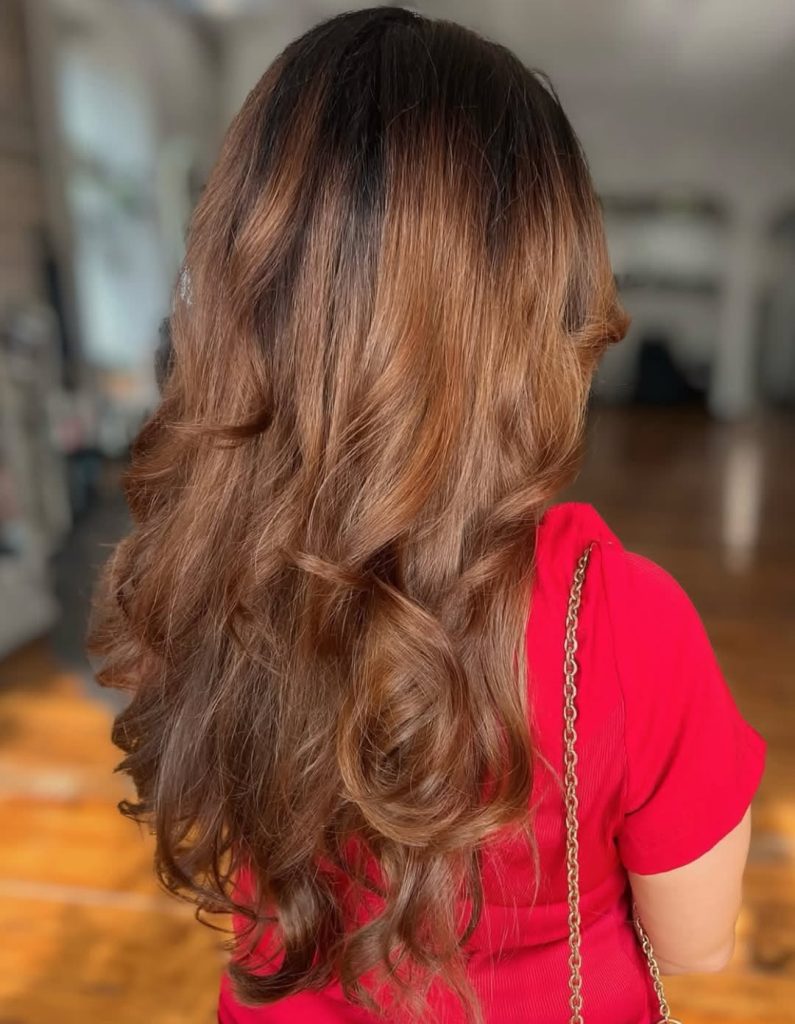 This look has that effortless “everything just works” energy. The caramel brown base feels rich and comforting, while the honey balayage adds softness and movement through the waves. It’s modern, flattering, and full of life—the kind of hair that makes you feel like you’ve made a quiet but powerful upgrade.