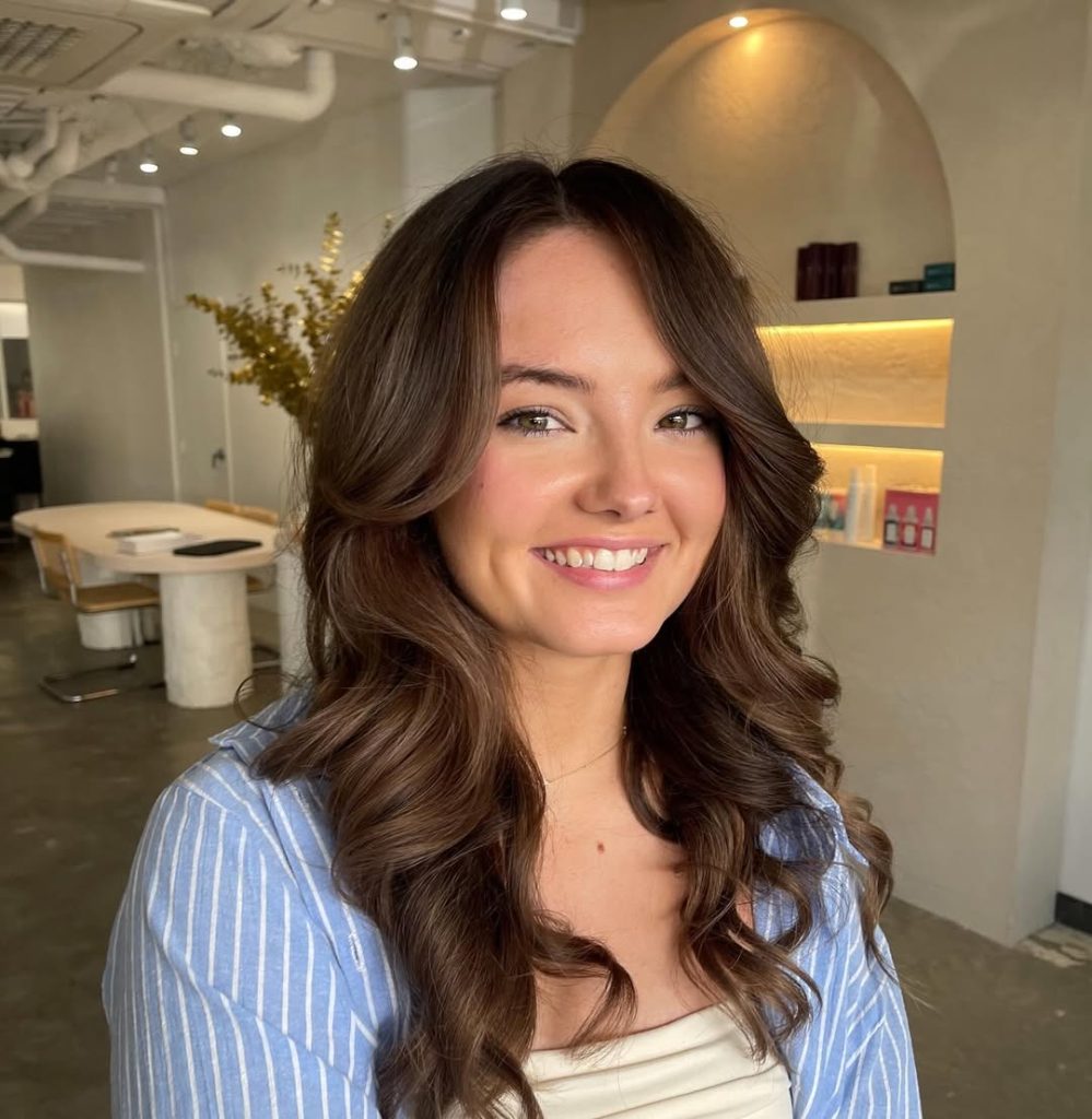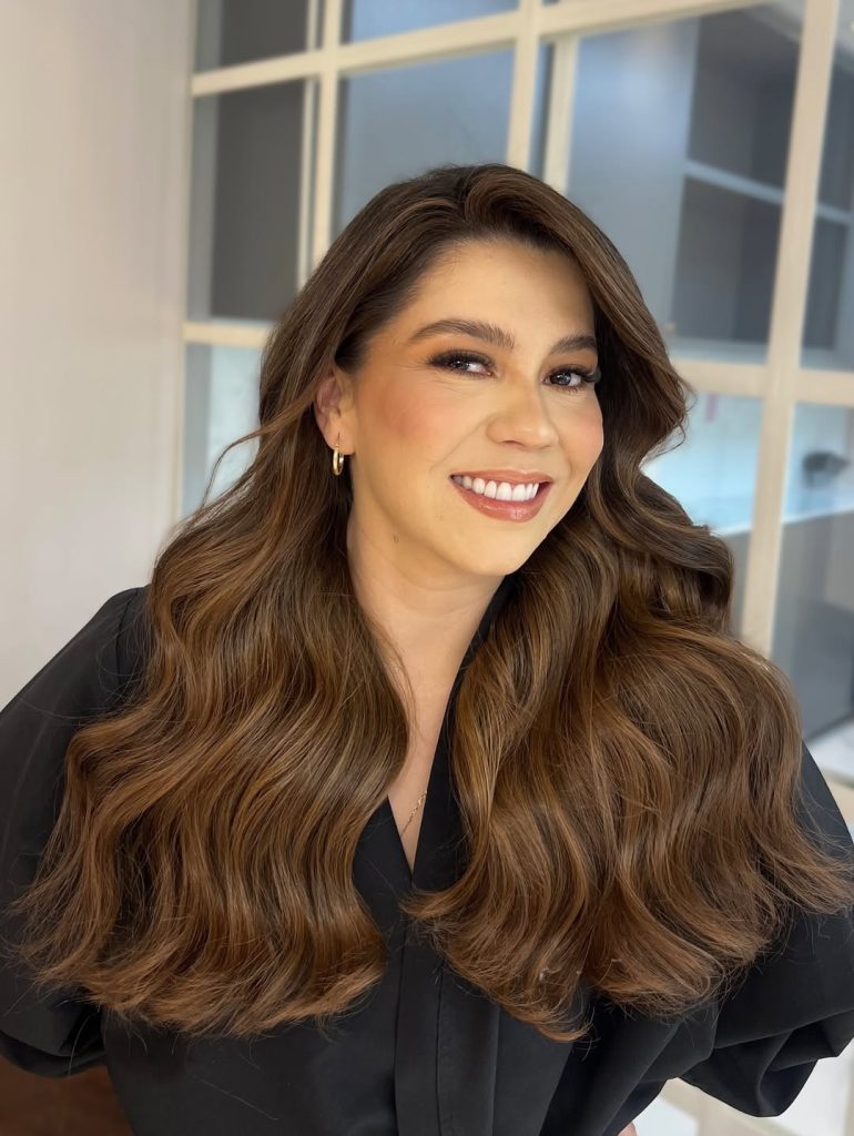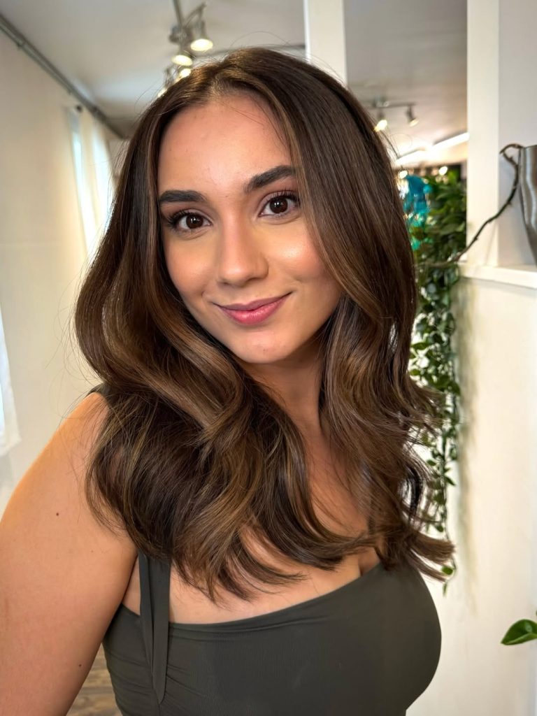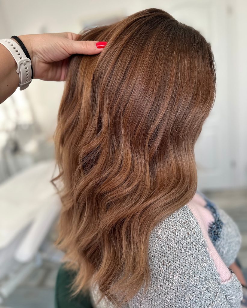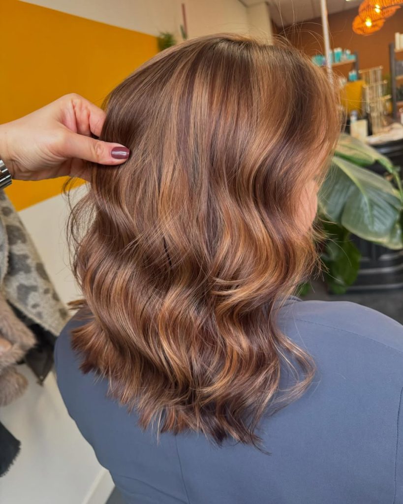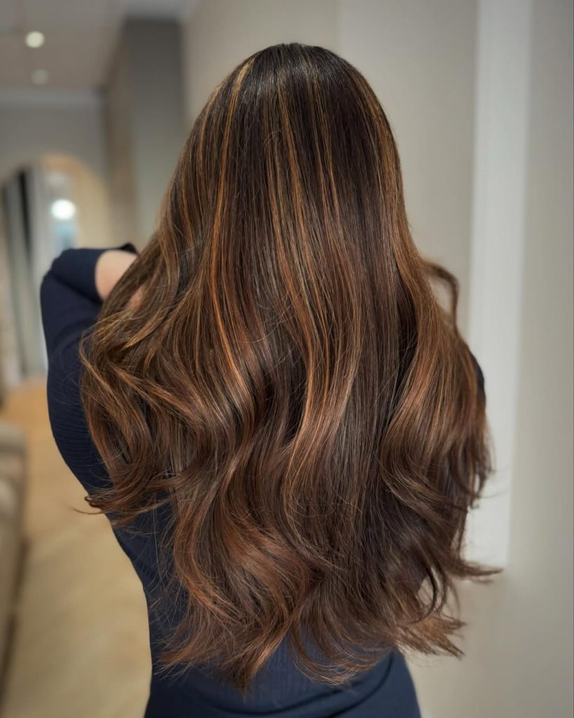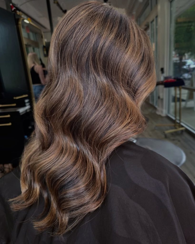 There’s a romantic depth to this rich caramel brown, enhanced by flowing waves and a gentle honey balayage. The color feels dimensional and lived-in, like it’s evolved naturally over time rather than being freshly “done.” It’s warm, inviting, and incredibly wearable.