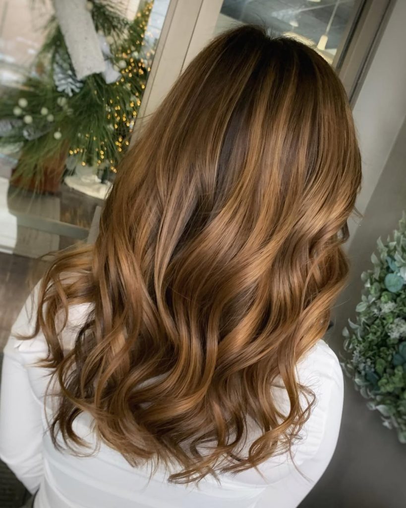 29. Dimensional Caramel Brown with Honey Balayage Waves
