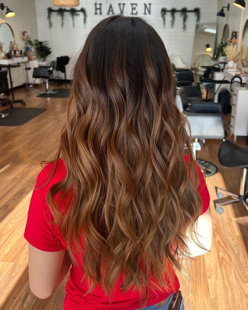 Styling-wise, the result is a dream for women who enjoy movement in their hair. The balayage placement adds light through the mid-lengths, making hair appear fuller and more dynamic. It’s especially flattering on wavy or curly textures and works well for women looking for color ideas that don’t require constant upkeep.