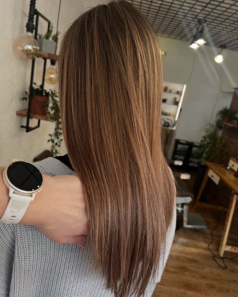 Long straight hair with a smooth and even caramel brown color looks gorgeous with a high shine. The shine provides the hair with a strong and confident presence and a modern touch. The style is minimal with a modern and elegant touch.