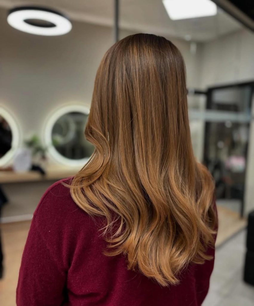 The balance between structure and softness is what makes this cut special. The layers frame the face gently, which works beautifully for medium to long hair and suits a wide range of face shapes. The caramel tone brightens the complexion without overpowering it. It’s an excellent choice if you want color that feels fresh, elegant, and simple to live with day after day.
