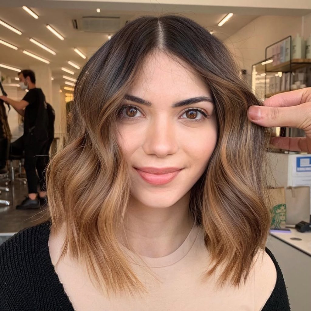 This style feels cheerful and confident, with soft waves and golden highlights that brighten the overall look. The caramel brown base deepens the style, and the lighter pieces warm and move the face. It has an approachable charm that feels very current.