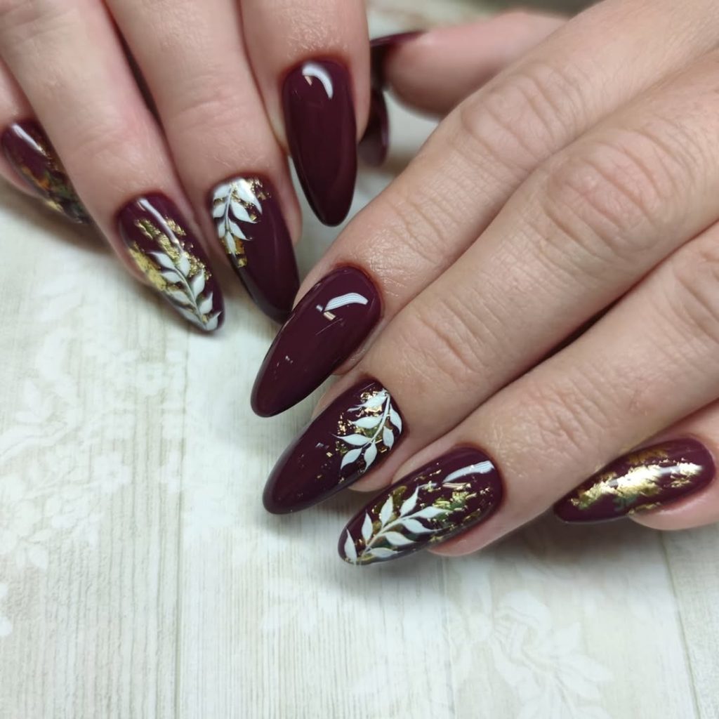 1. Dark Cherry Almond Nails with Gold Leaf Art