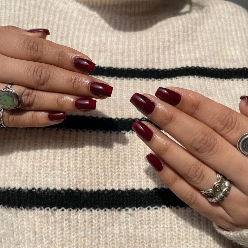 This dark cherry red manicure feels sharp, modern, and quietly powerful. The square shape gives the color structure, making it look intentional and confident rather than soft or romantic.