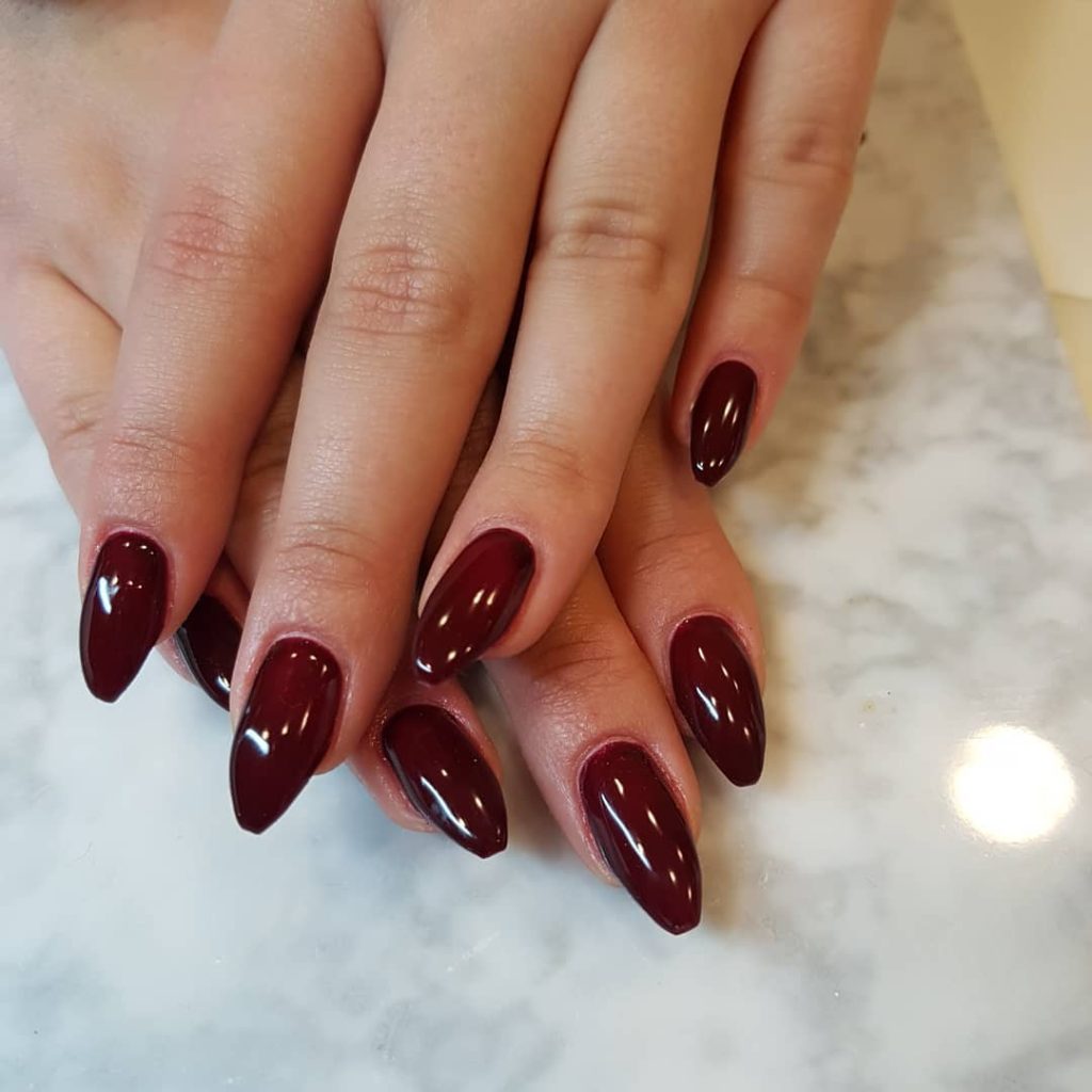 13. Dark Cherry Almond Nails with a Classic Gloss