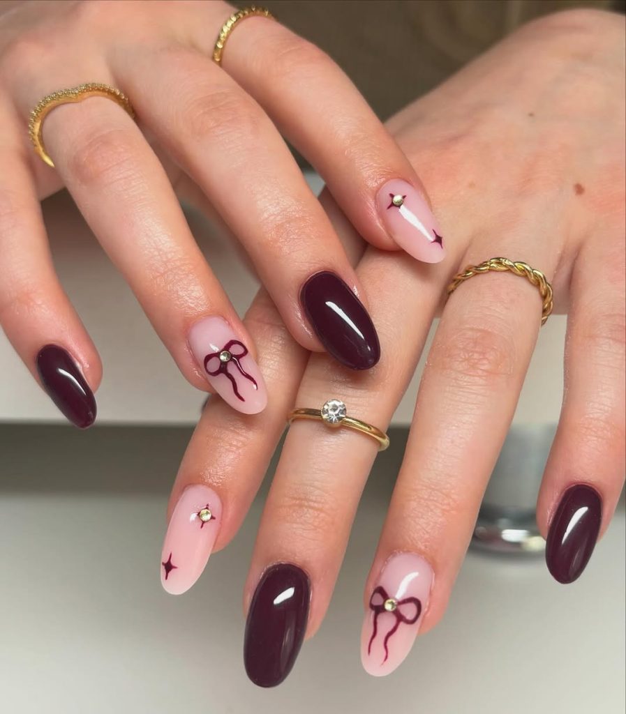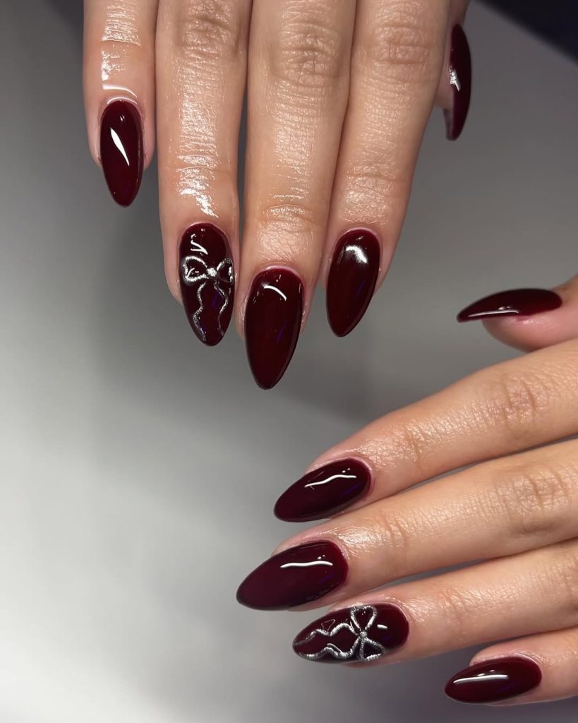 15. Dark Cherry Almond Nails with Silver Bow Art