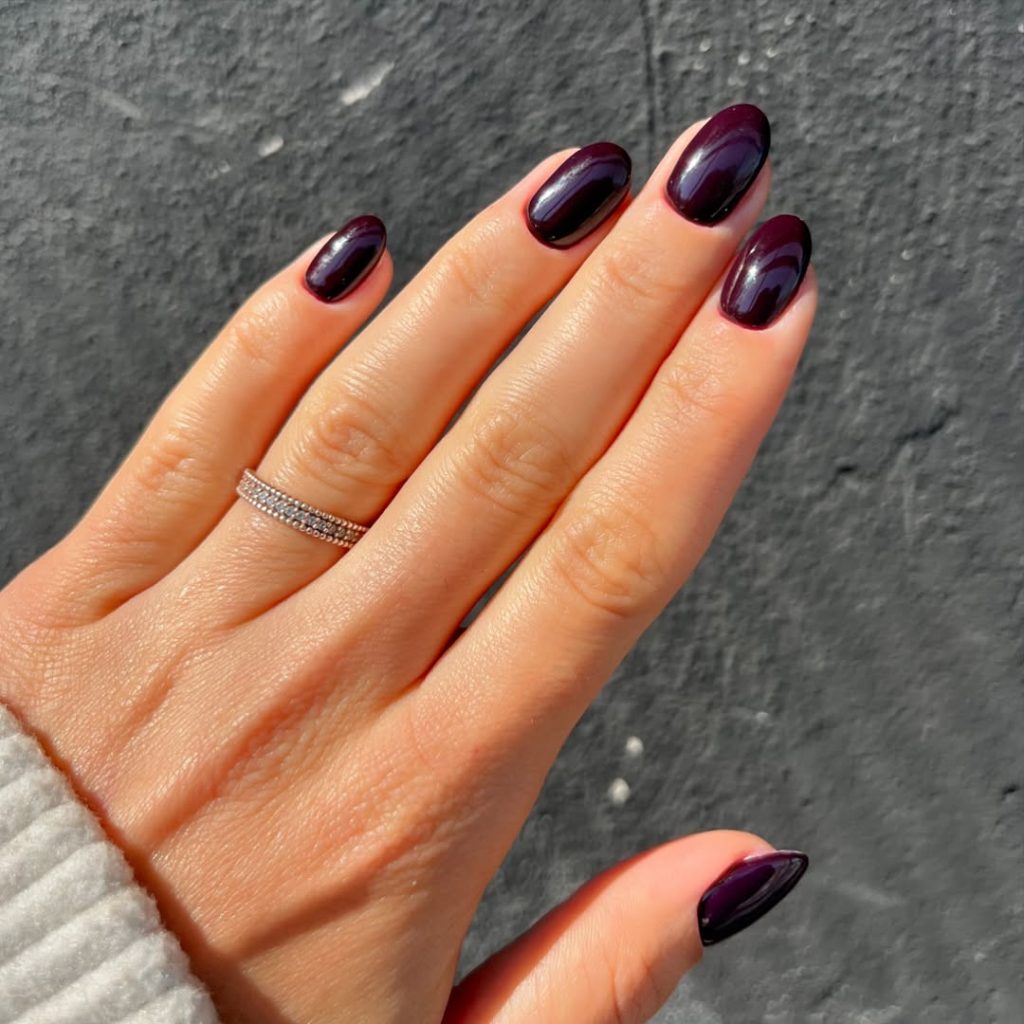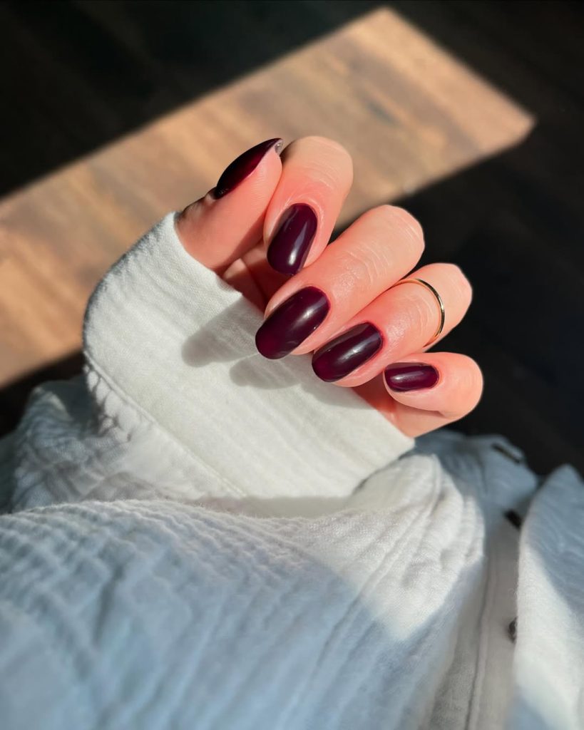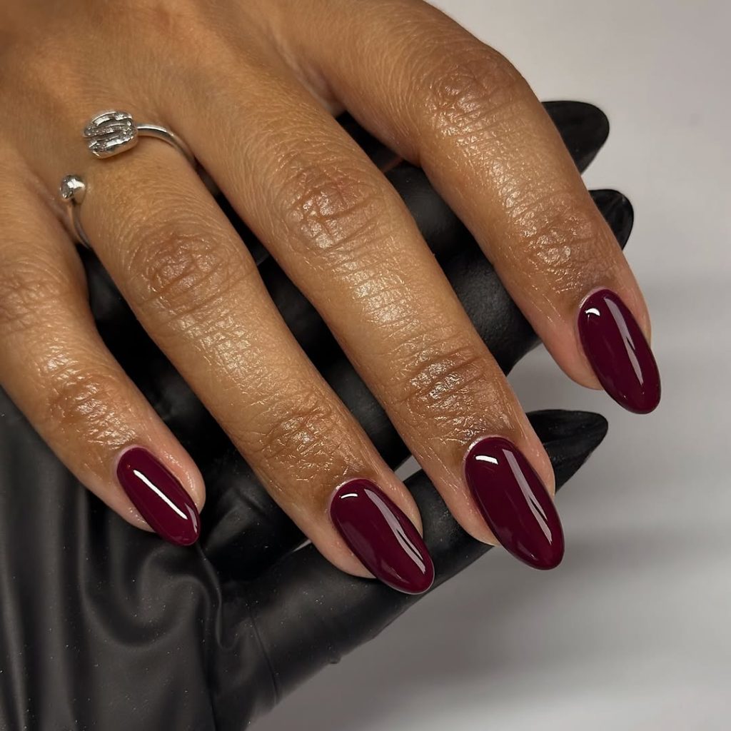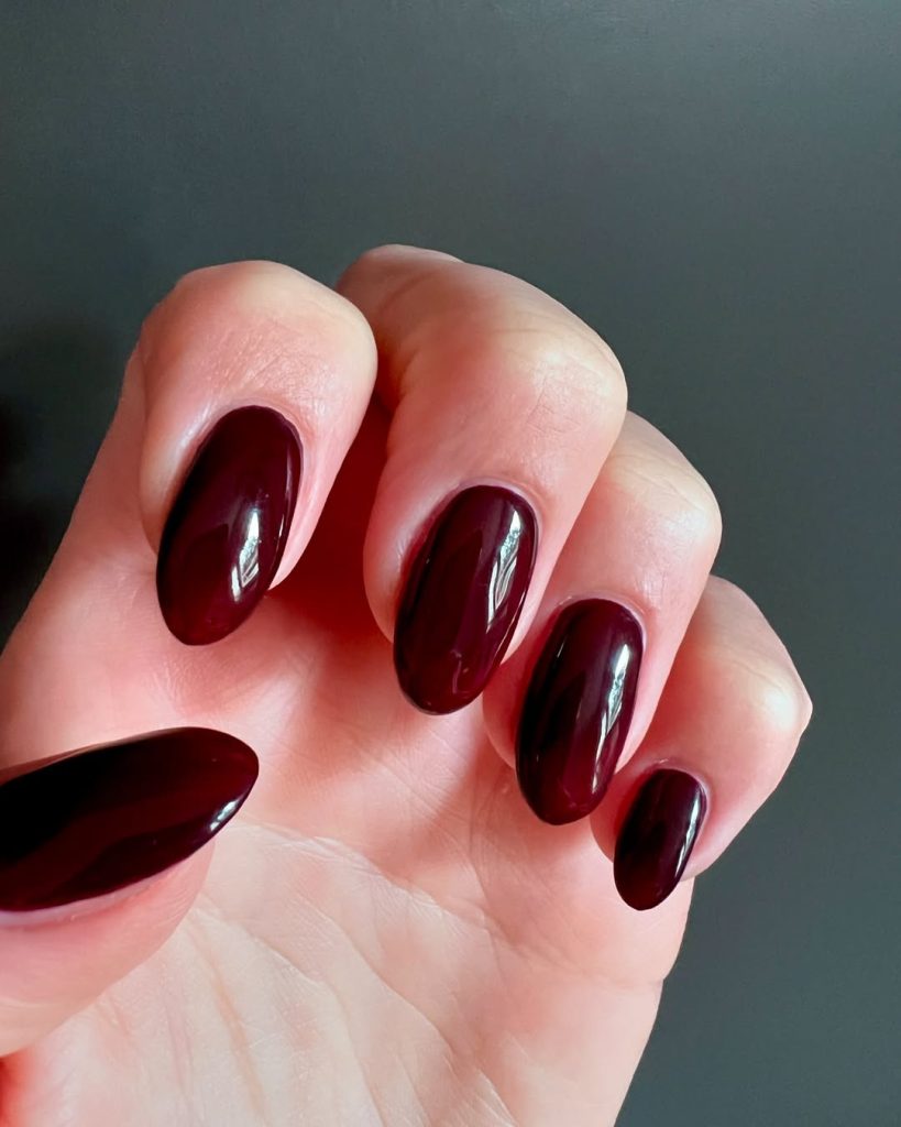 16. Dark Cherry Short Almond Nails with a Natural Gloss