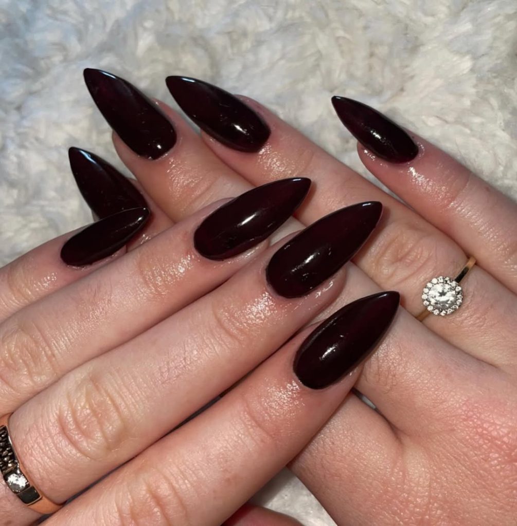 17. Dark Cherry Long Almond Nails with a Deep Gloss Finish
