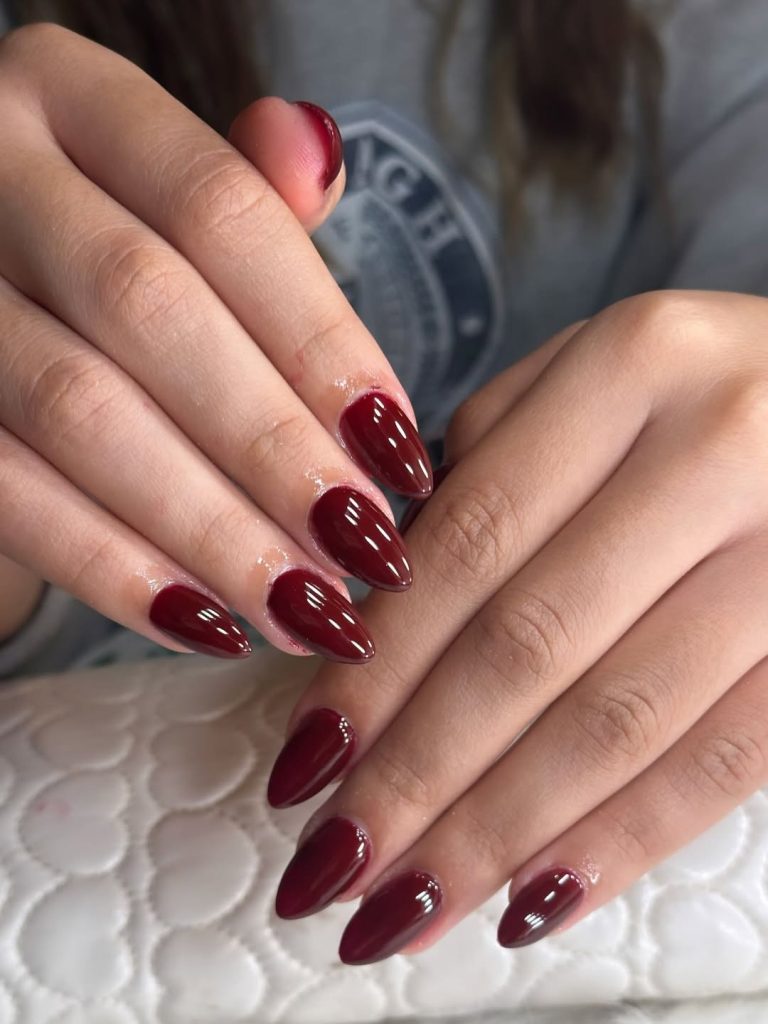 This dark cherry manicure feels modern, fresh, and effortlessly cool. The clean almond shape and high-gloss finish keep the focus on the color itself, allowing its depth and richness to shine.