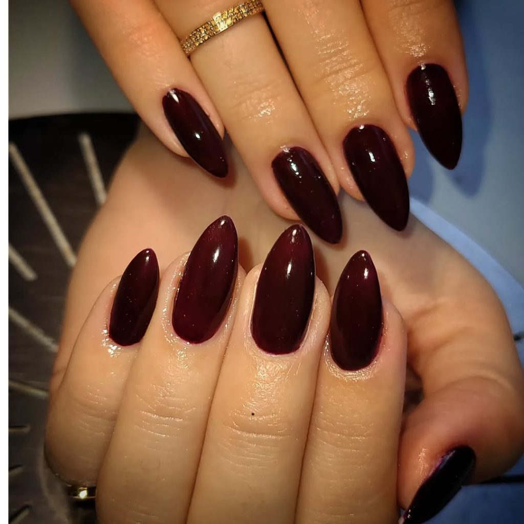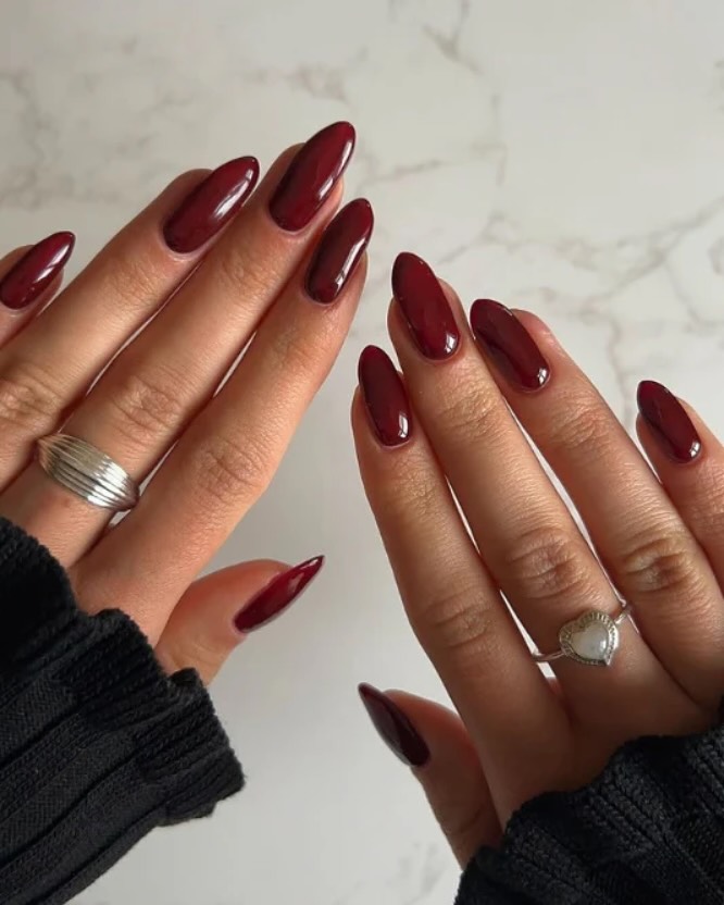 24. Dark Cherry Almond Nails with a Deep Gloss Finish