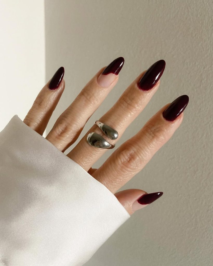 22. Dark Cherry Almond Nails with a Modern Reverse French