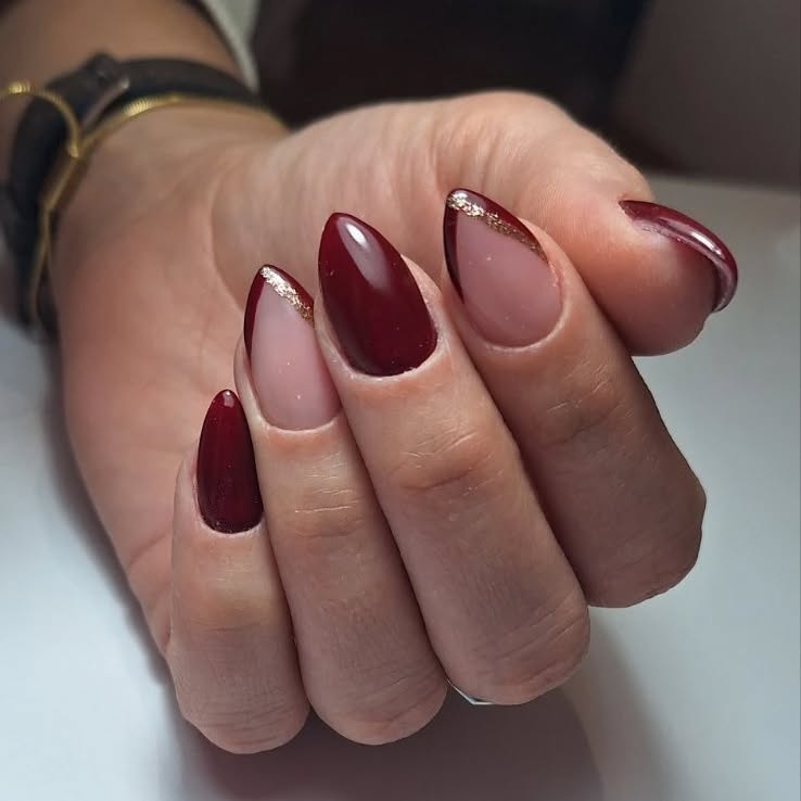 This dark cherry red manicure feels like something you’d wear when you want your hands to quietly steal the spotlight. The almond shape softens the deep wine tone, while the delicate gold detailing adds an almost jewelry-like elegance. It’s rich without being heavy, decorative without feeling fussy, and has that timeless charm that works just as beautifully with a cozy sweater as it does with an evening dress. There’s a confidence here that doesn’t shout—it simply knows it looks good.