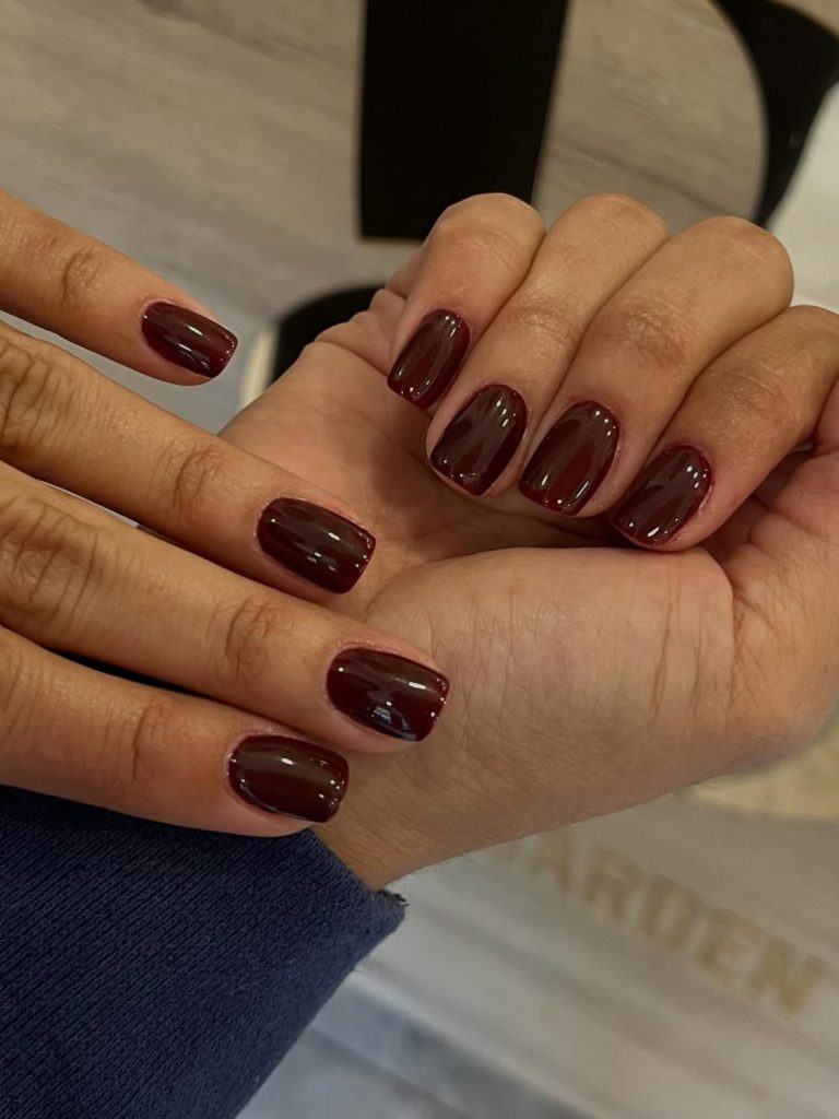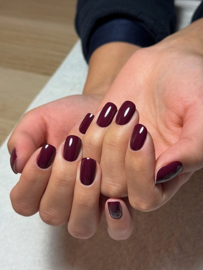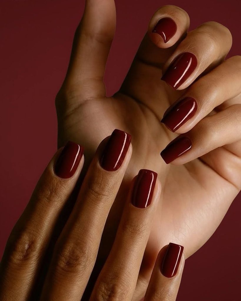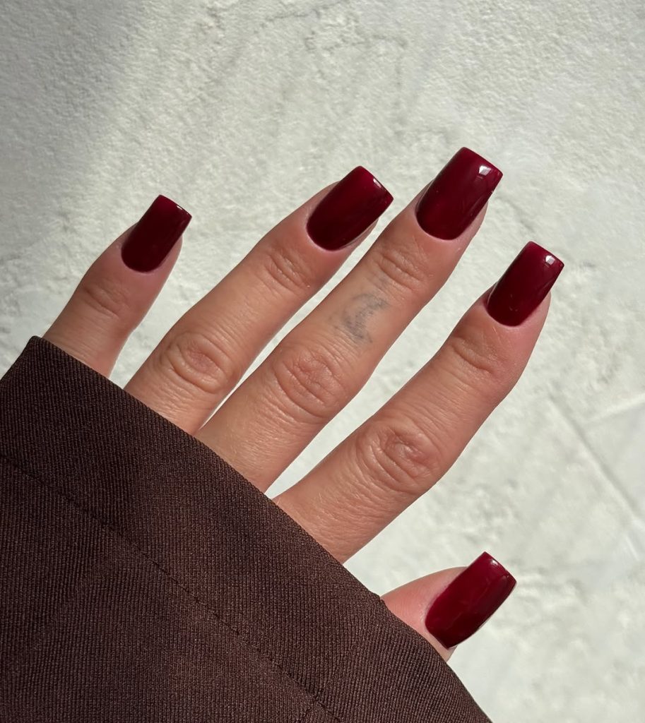 This dark cherry manicure feels neat, practical, and beautifully understated. The short square shape keeps the look grounded and easy, while the deep red tone adds just enough richness to feel styled.
