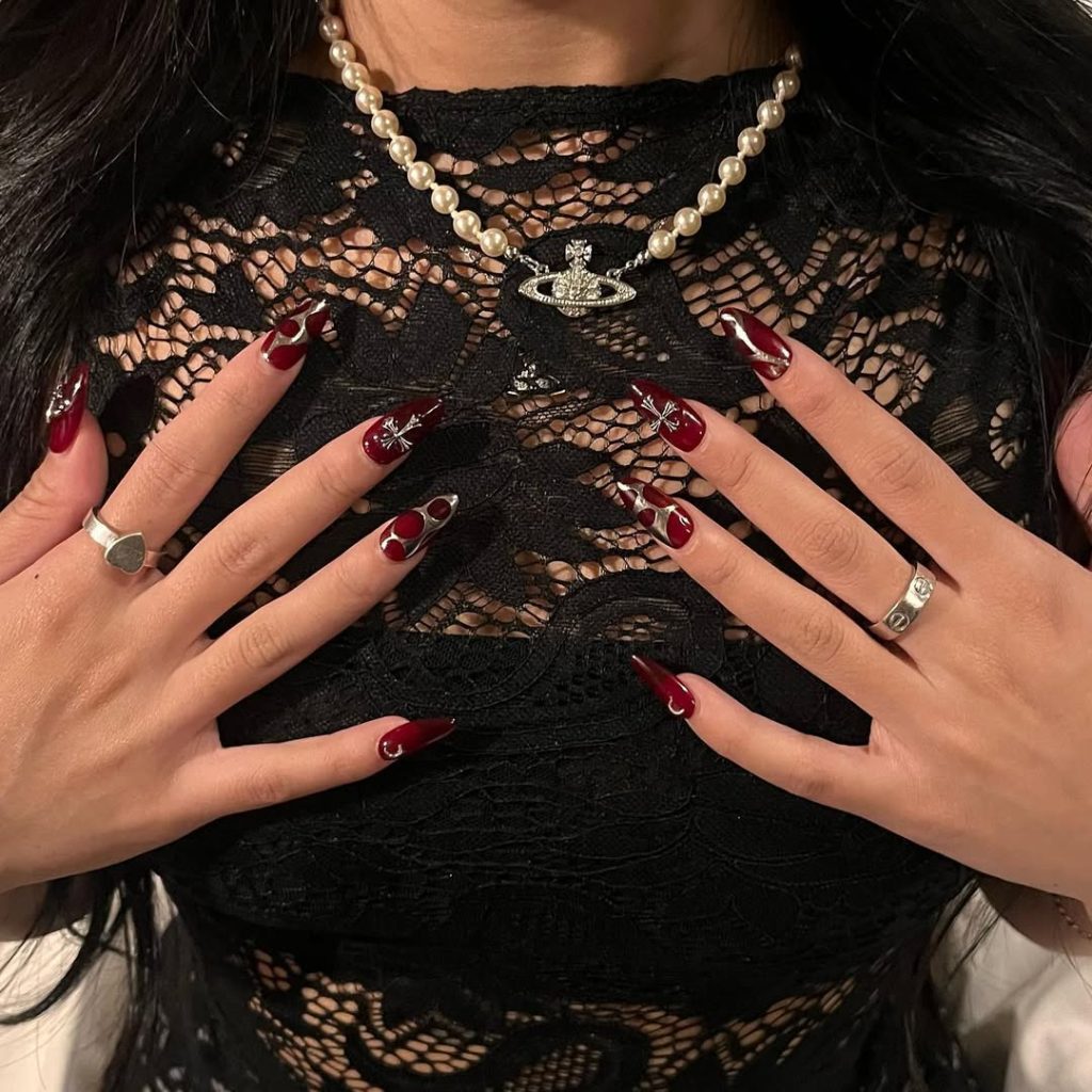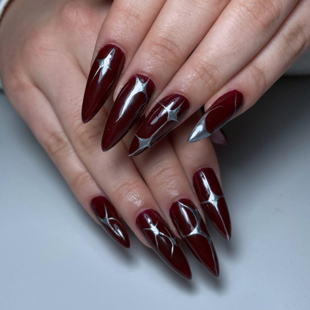 This dark cherry manicure feels bold, edgy, and artistic. The elongated almond shape creates drama, while the silver art detailing adds a futuristic touch that instantly sets it apart.