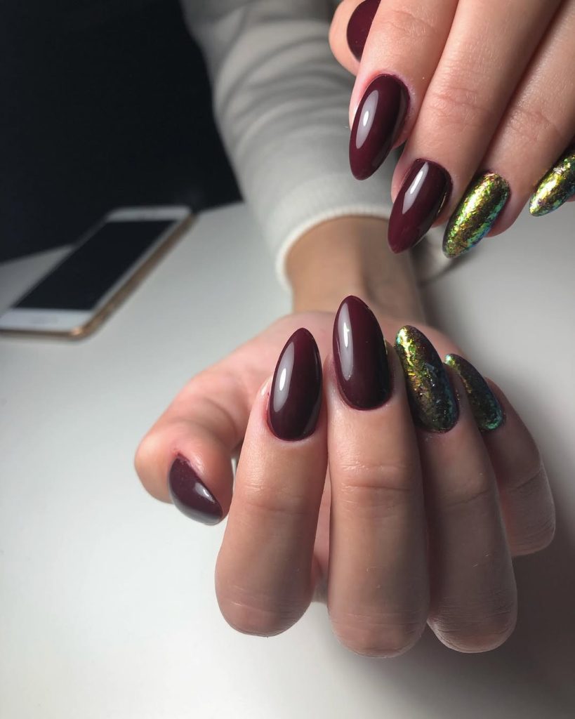5. Dark Cherry Almond Nails with Green-Gold Accent