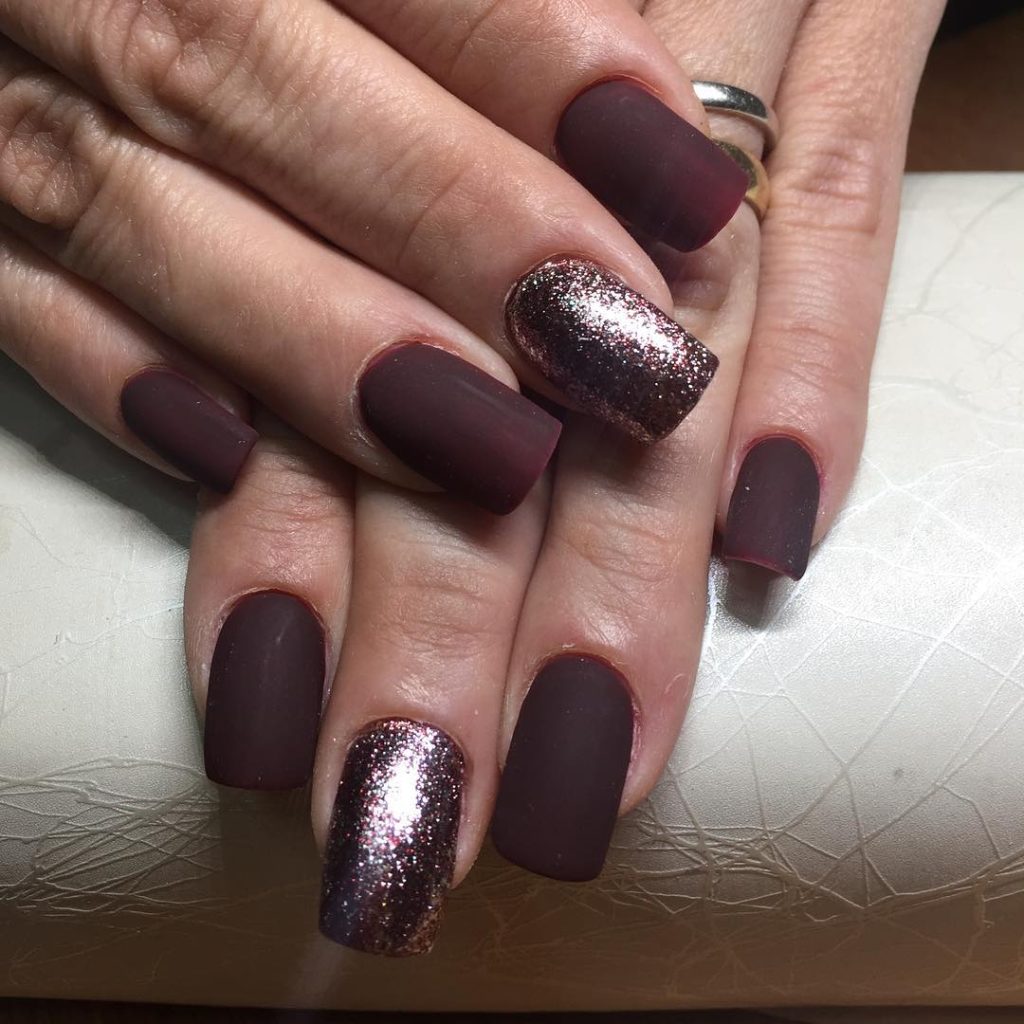 8. Matte Dark Cherry Square Nails with Sparkle Accent