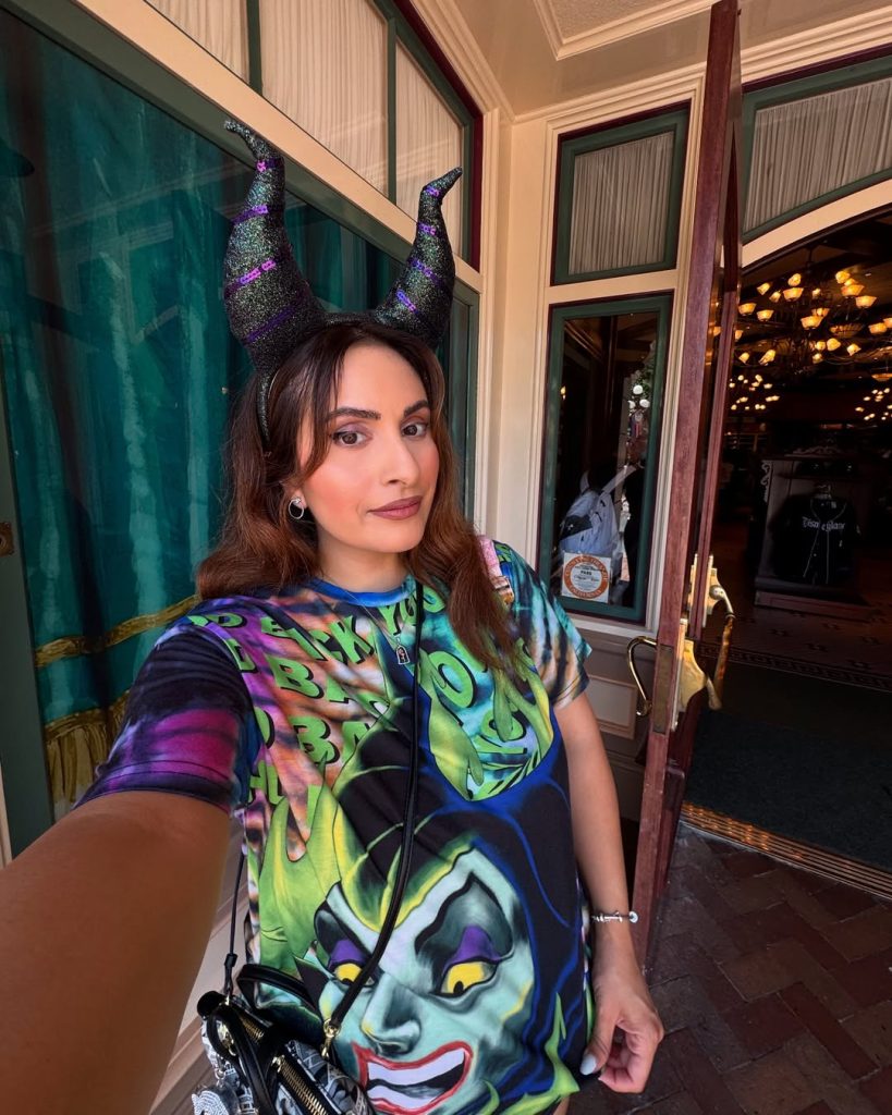 This bold aesthetic works beautifully for October, Halloween parties, or themed park days where expressive fashion is encouraged. To elevate the character energy, consider smoky eye makeup or a muted lip, letting the tee remain the star. Avoid busy bottoms—sleek black denim or biker shorts help maintain the outfit’s clarity. Perfect for fans who prefer a dramatic twist rather than princess sweetness.