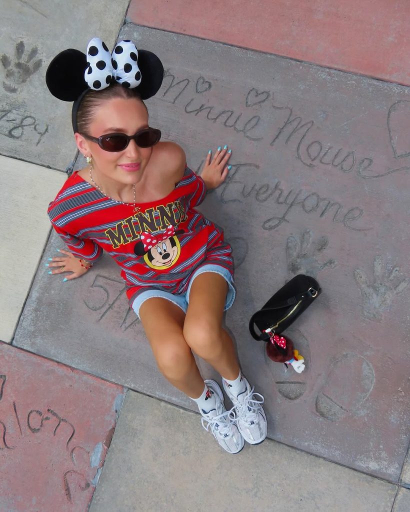 An oversized striped top, denim shorts, and polka-dot Minnie ears bring effortless comfort with a bold splash of character energy.