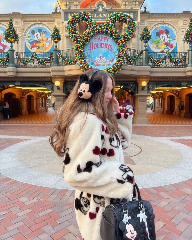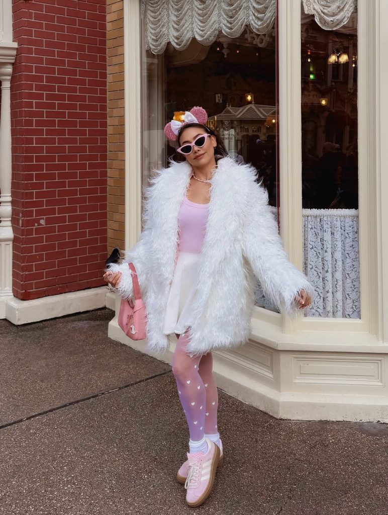 This outfit is tailor-made for winter Christmas trips or whimsical December visits where cozy textures meet playful elegance. Its pastel palette fits beautifully into the broader aesthetic trends of 2026, especially for fans who prefer gentle, romantic styling over bold primaries. Adding personality with pearl earrings or a snowflake hair clip is a lovely touch. Dark layers underneath should be avoided, as they disrupt the airy fantasy. This outfit is a soft princess energy dream with the comfort of modern-day styles.