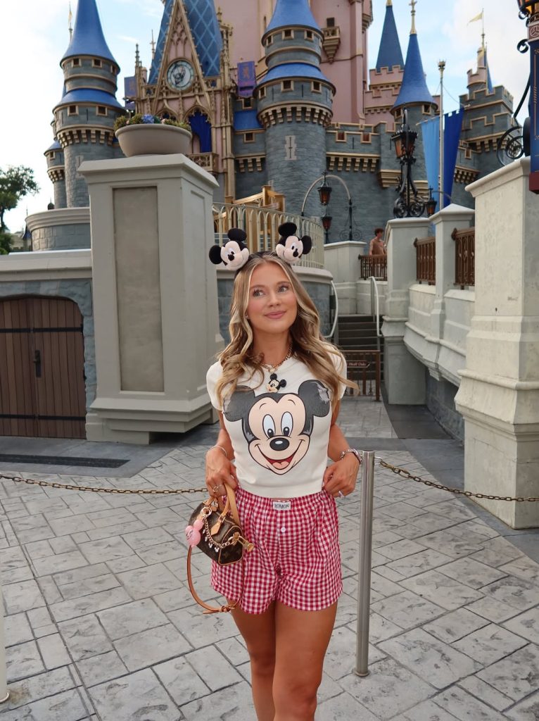 A fitted Mickey tee and gingham shorts create an upbeat, summery look blending retro Disney spirit with light, breathable comfort.