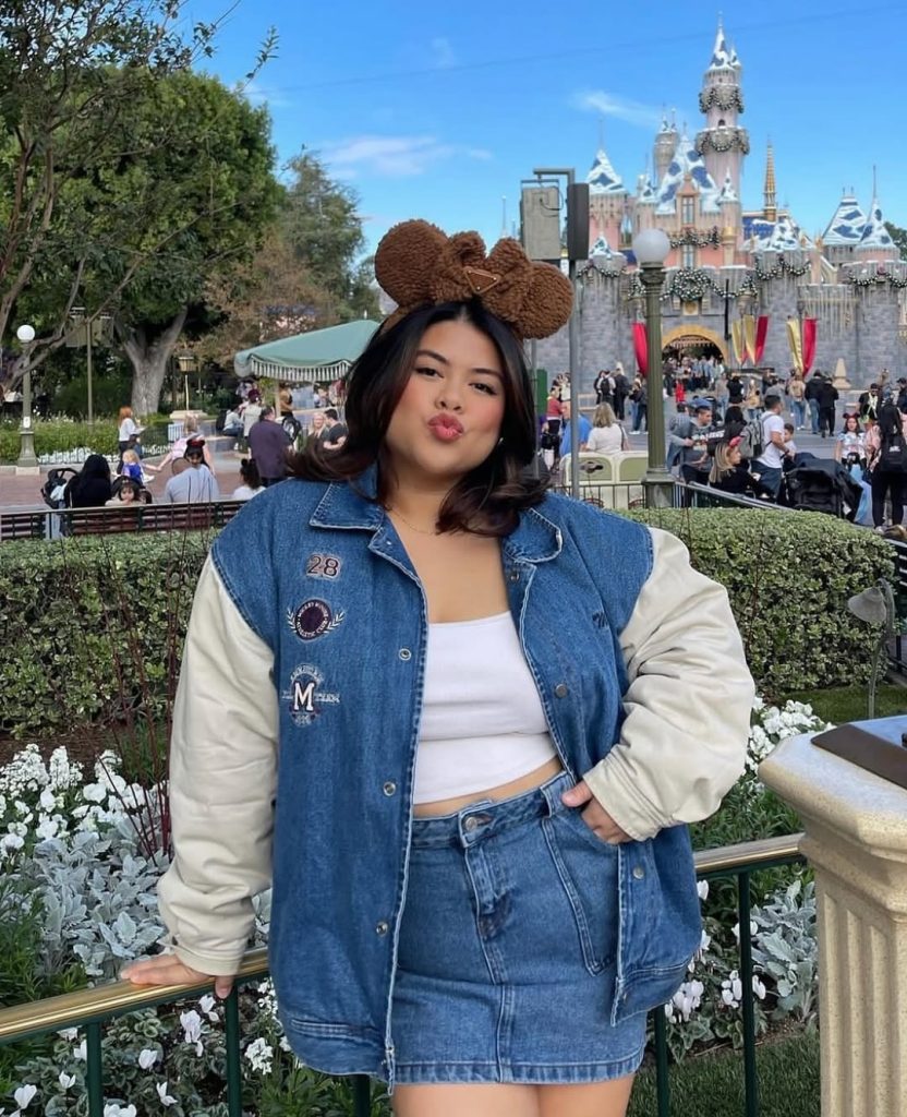 This outfit shines during December celebrations, winter Christmas parties, and evening parades when the air cools. The vibrant jacket taps into vintage varsity trends that have resurfaced across Disney streetwear collections. To enhance personality, add glitter eyeliner or pearl hairpins. Avoid bulky scarves that could clutter the neckline—opt for subtle layering instead. The entire look feels wonderfully spirited, perfect for anyone leaning into joyful fantasy.