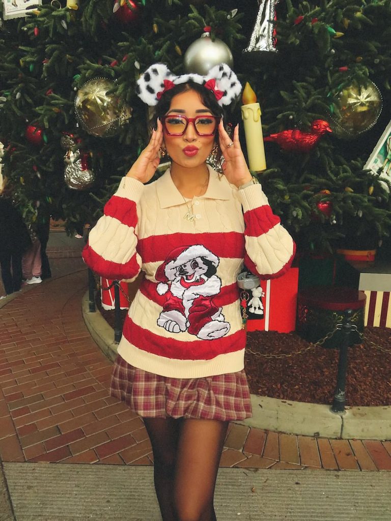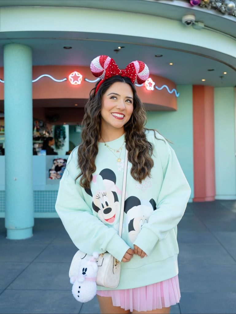 This outfit is a joyful nod to festive ideas and retro animation fans. Perfect for December evenings, tree-lighting events, or café breaks between rides. To personalize the look, layer a collared shirt under the sweater or add vintage-style boots. Avoid overly formal accessories—this style thrives on whimsy and warmth. It’s a wonderful example of how fall and winter influences merge into expressive park fashion.