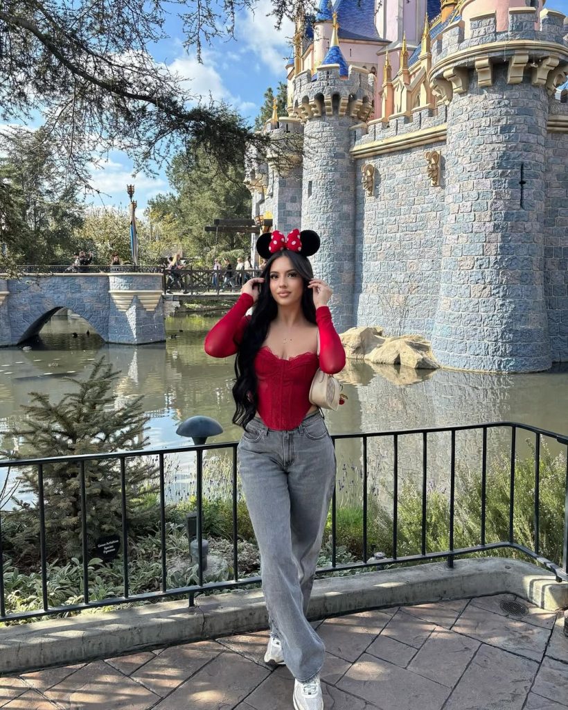A striking red corset top paired with relaxed denim creates a modern, confident silhouette infused with Minnie-inspired femininity.