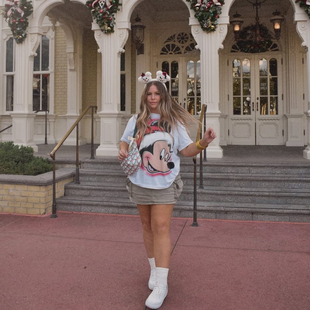A loose Mickey tee, khaki shorts, and festive Minnie ears create a laid-back holiday outfit ideal for warm-weather December visits.