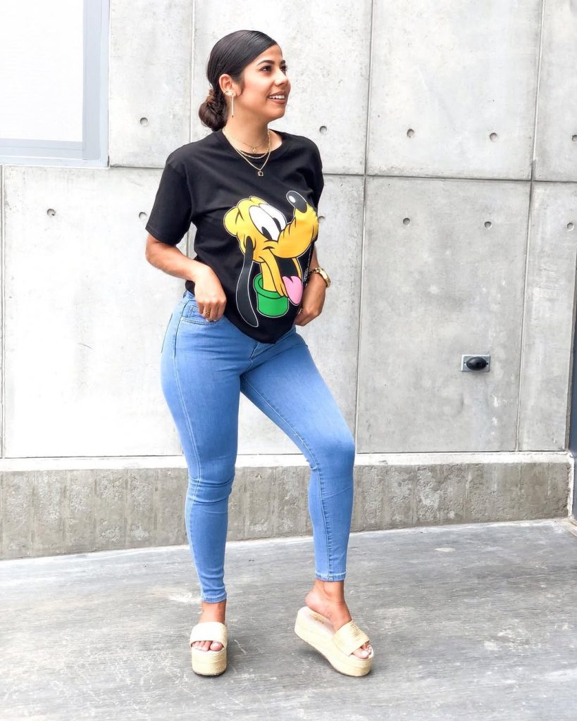 A bold Pluto tee and fitted denim create a bright, cheerful outfit that feels suitable for casual days both in and outside the park.
