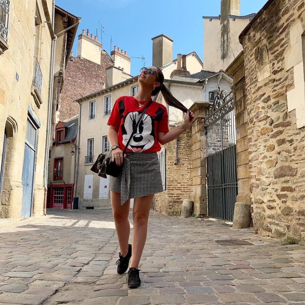Mixes a bold red Minnie tee with a checked wrap skirt for a combo of casual Disney charm with a stylish European streetwear edge.