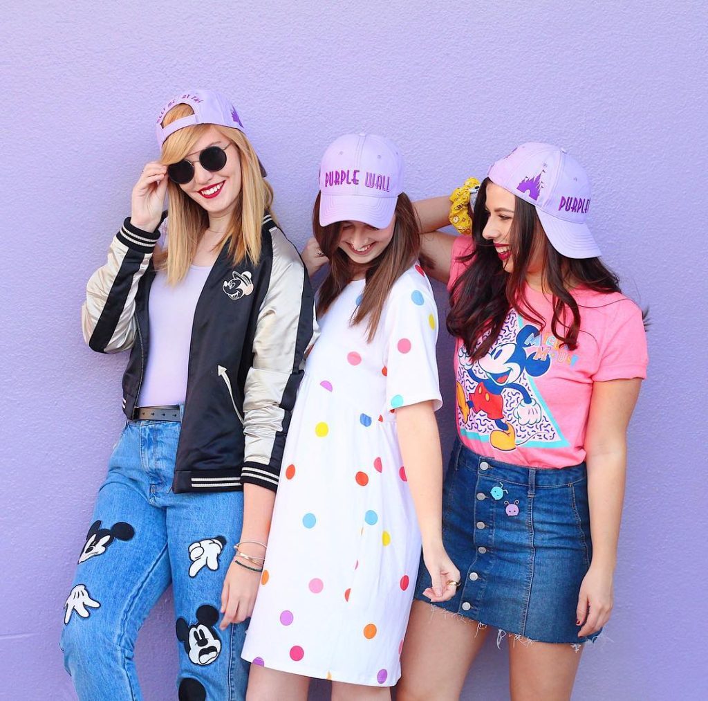 This trio captures the essence of ideas for friendship shoots at iconic Disney photo spots. The bright pastel-lavender theme feels especially fitting for spring visits when color is everywhere. Each look provides flexibility: add crossbody bags or enamel pins to enhance individuality. Avoid overly formal footwear—casual sneakers keep the playful energy alive. Perfect for fans who love matching yet distinct coordinating styles.