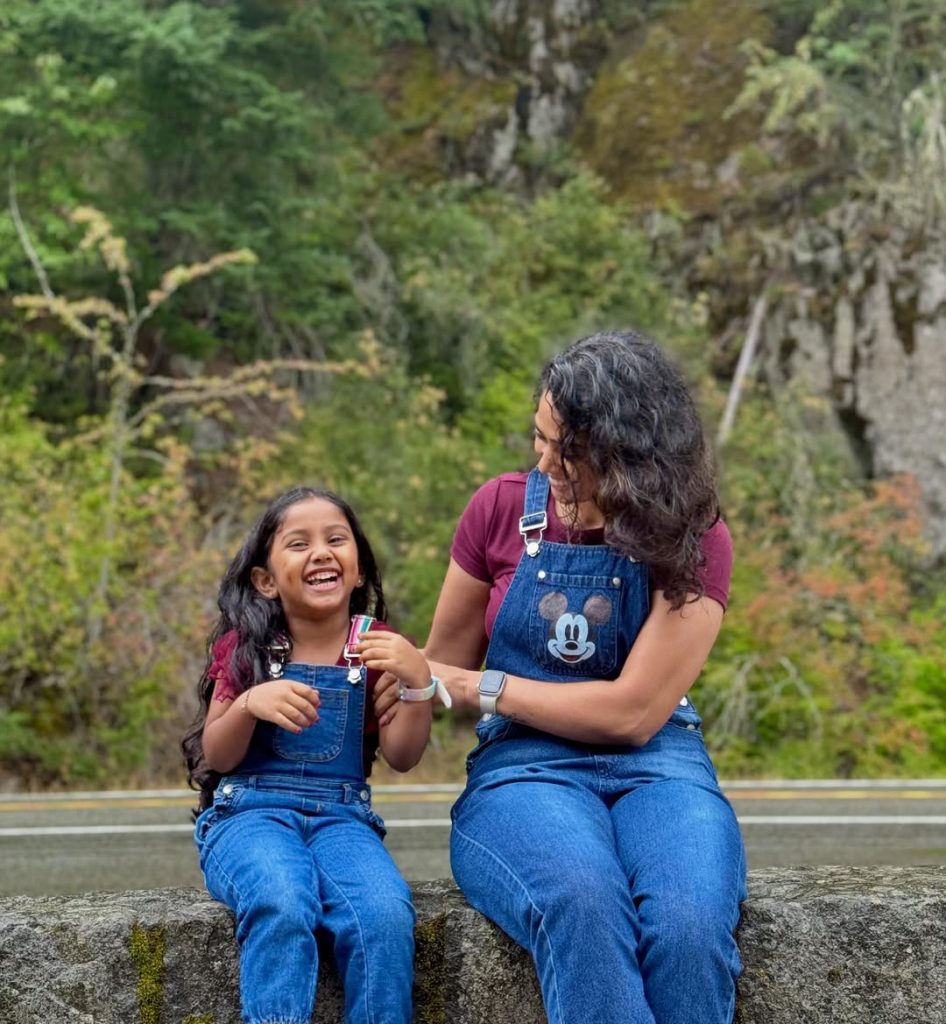 Coordinated denim overalls and burgundy tees bring a heartwarming, relaxed vibe perfect for family trips and candid outdoor memories.