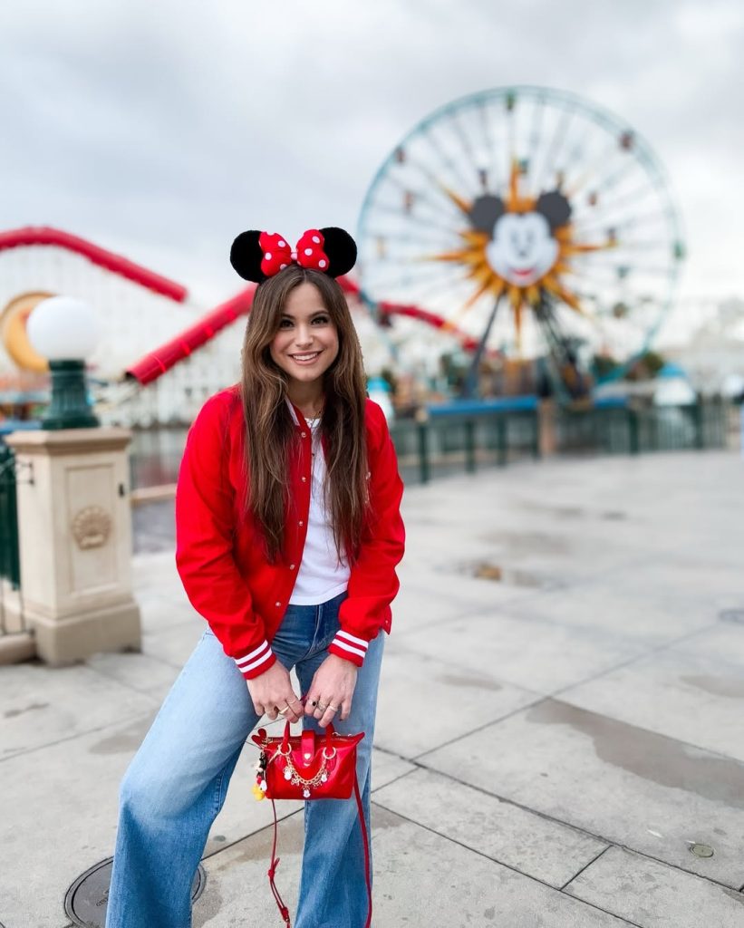 A bright red varsity jacket, wide-leg denim, and iconic Minnie ears create a cheerful, nostalgic, park-ready outfit with timeless charm.