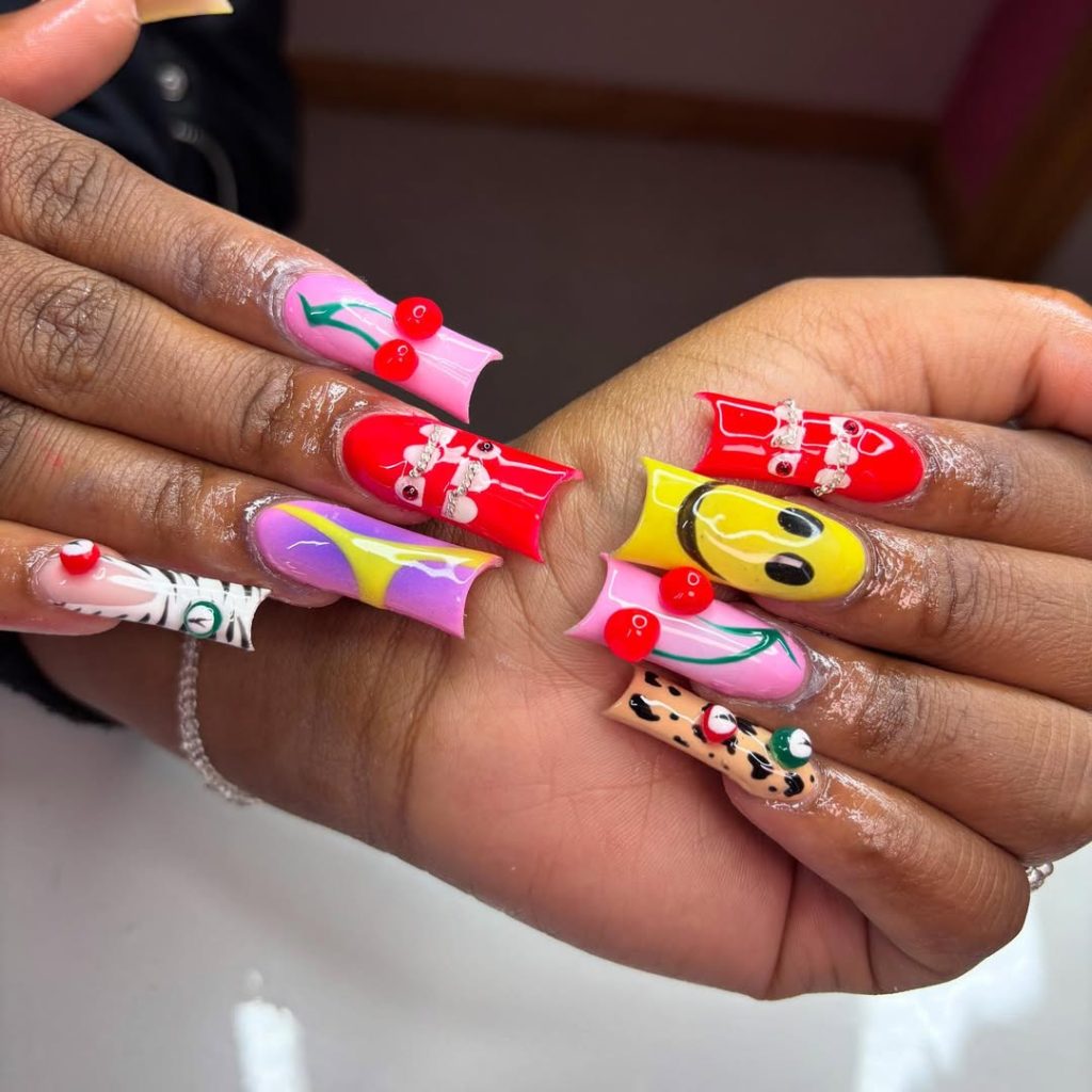 These junk nails feel like pure fun bottled up into a manicure. The mix of cherries, a bold smiley face, red sneakers, and vibrant pink and purple swirls create a colorful explosion that feels lighthearted and bold at the same time. They’re not just nails, they’re conversation starters, making every hand gesture feel like a mini fashion moment. This set is for the woman who embraces playful inspo and isn’t afraid to add a little whimsy to her look.