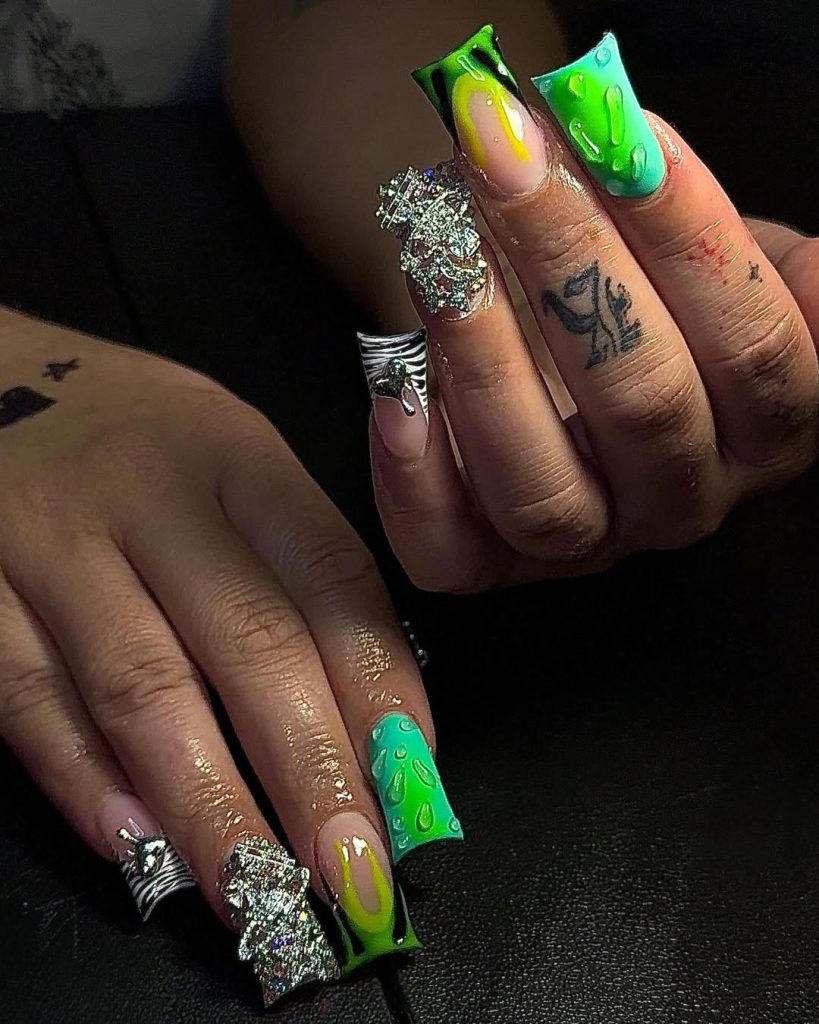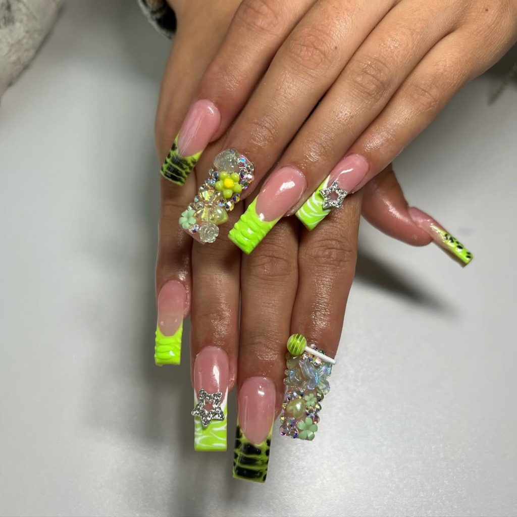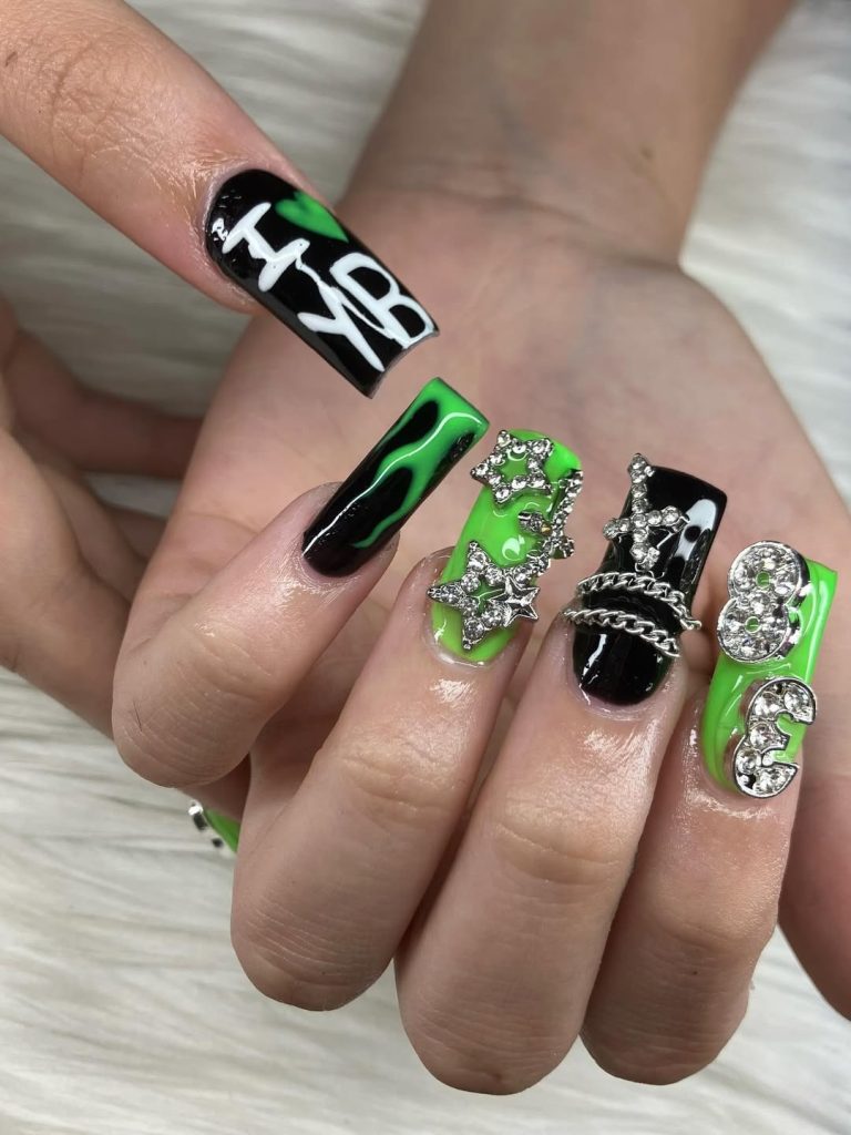 Perfect for those who love green designs and want something totally unique, this style thrives on long square nails. Pair it with black outfits or silver jewelry to make the colors pop. The 3D details and rhinestones need a sturdy gel base and top coat to ensure everything stays flawless.