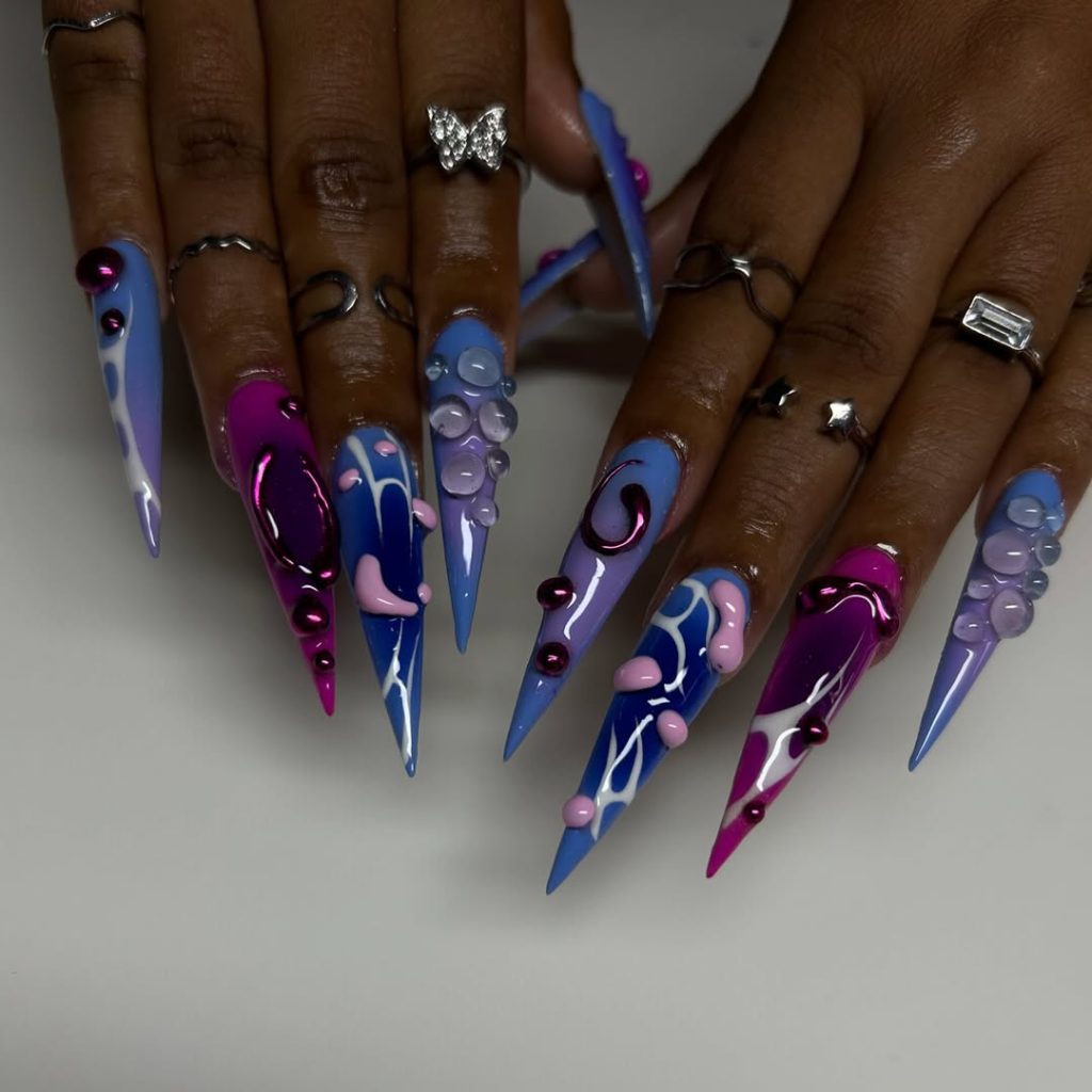 These long nails are pure colorful drama — the kind that turns every hand movement into a statement. The mix of blue, purple, and pink creates a dreamy, almost cosmic vibe, while the 3D bubble details and swirled designs make the look feel alive. It’s playful, bold, and unapologetically extra — the ultimate inspo for anyone who loves standing out.