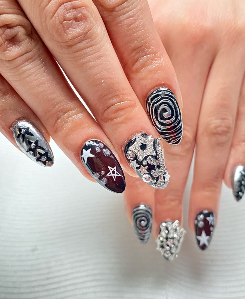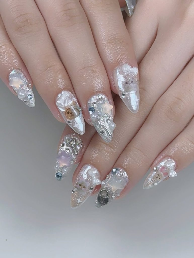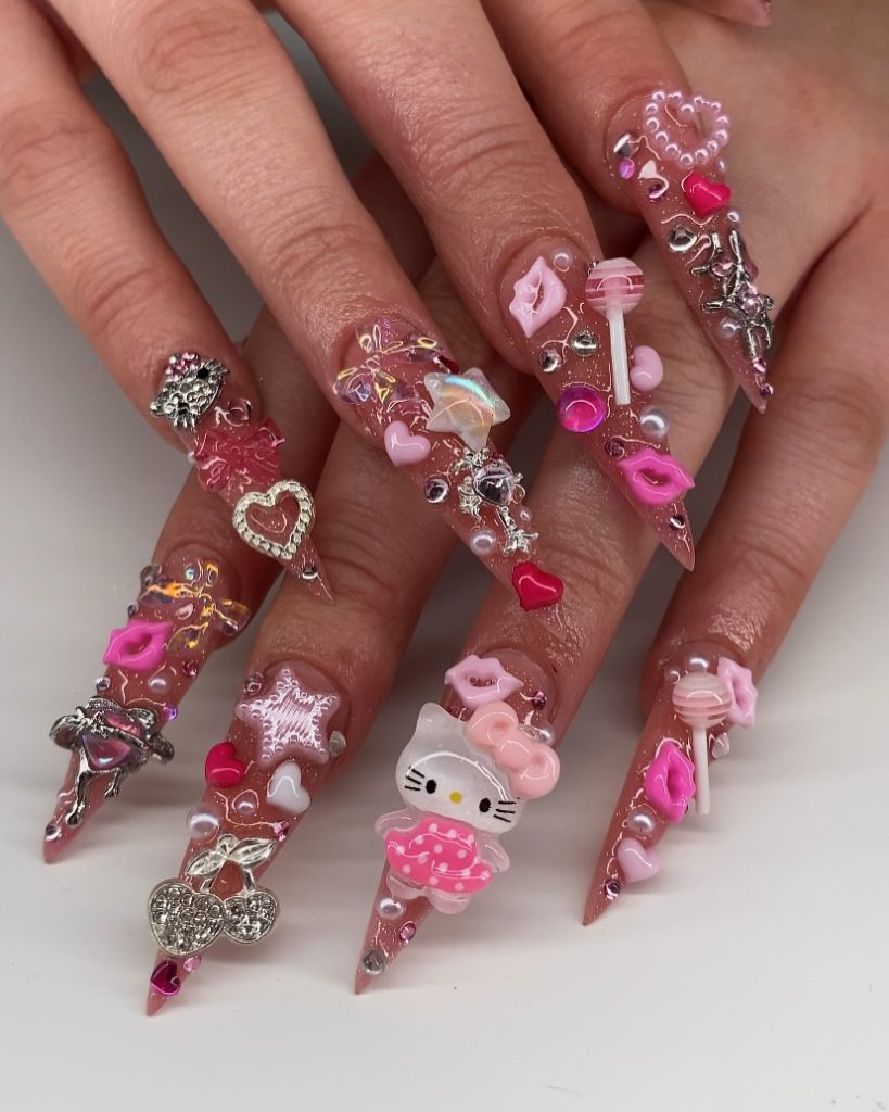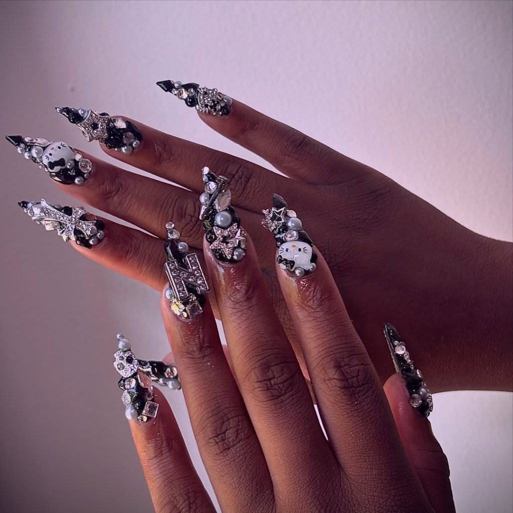 If maximalism had a mascot, these nails would be it. The black and silver palette gives a chic foundation, while pearls, stars, and Hello kitty charms bring a playful edge. Every nail is a mini art piece, packed with textures and unexpected elements that make you want to keep looking closer.