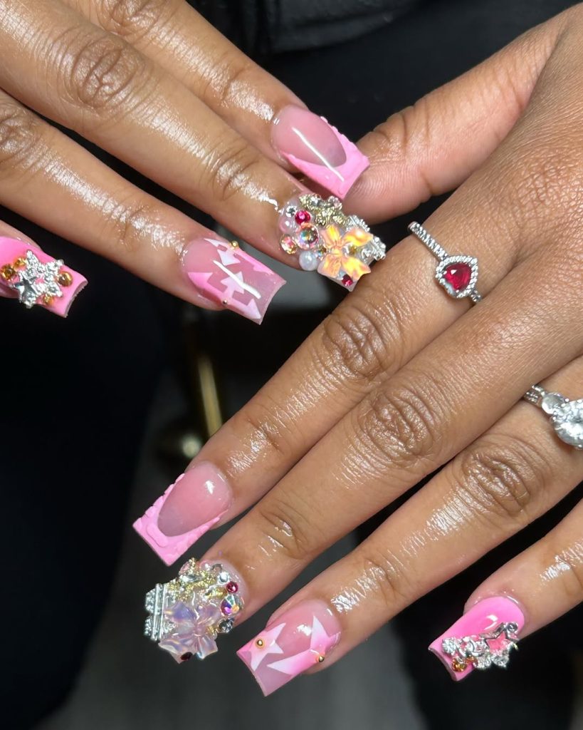 These pink nails bring cute energy with a luxurious twist. The soft pink base is elevated by star designs and oversized 3D gems, giving off a sweet-meets-opulent feel. It’s like bubblegum dreams collided with red carpet bling — fun, girly, and dazzling all at once.