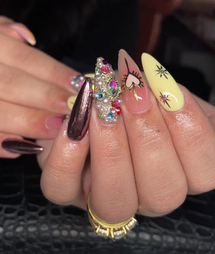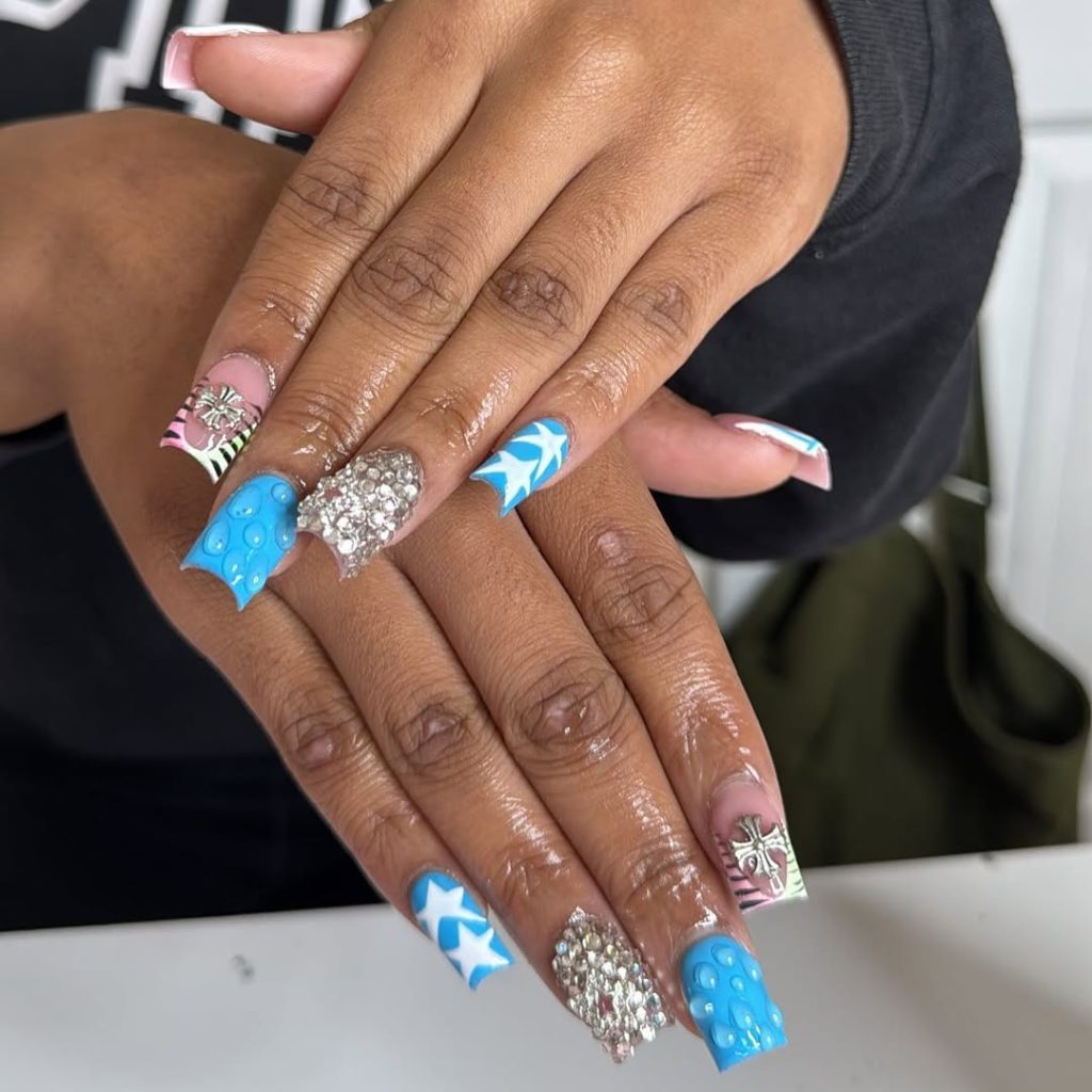 This set is a bold mashup of black and white stars, dreamy pastels, and heavy silver bling, all tied together with neon blue gems that pop against the background. It’s colorful, edgy, and futuristic all at once, creating the kind of nails that feel like wearable art. The way the chrome clusters stand out gives the nails an almost sculptural vibe, perfect for someone who loves over-the-top designs that double as accessories.