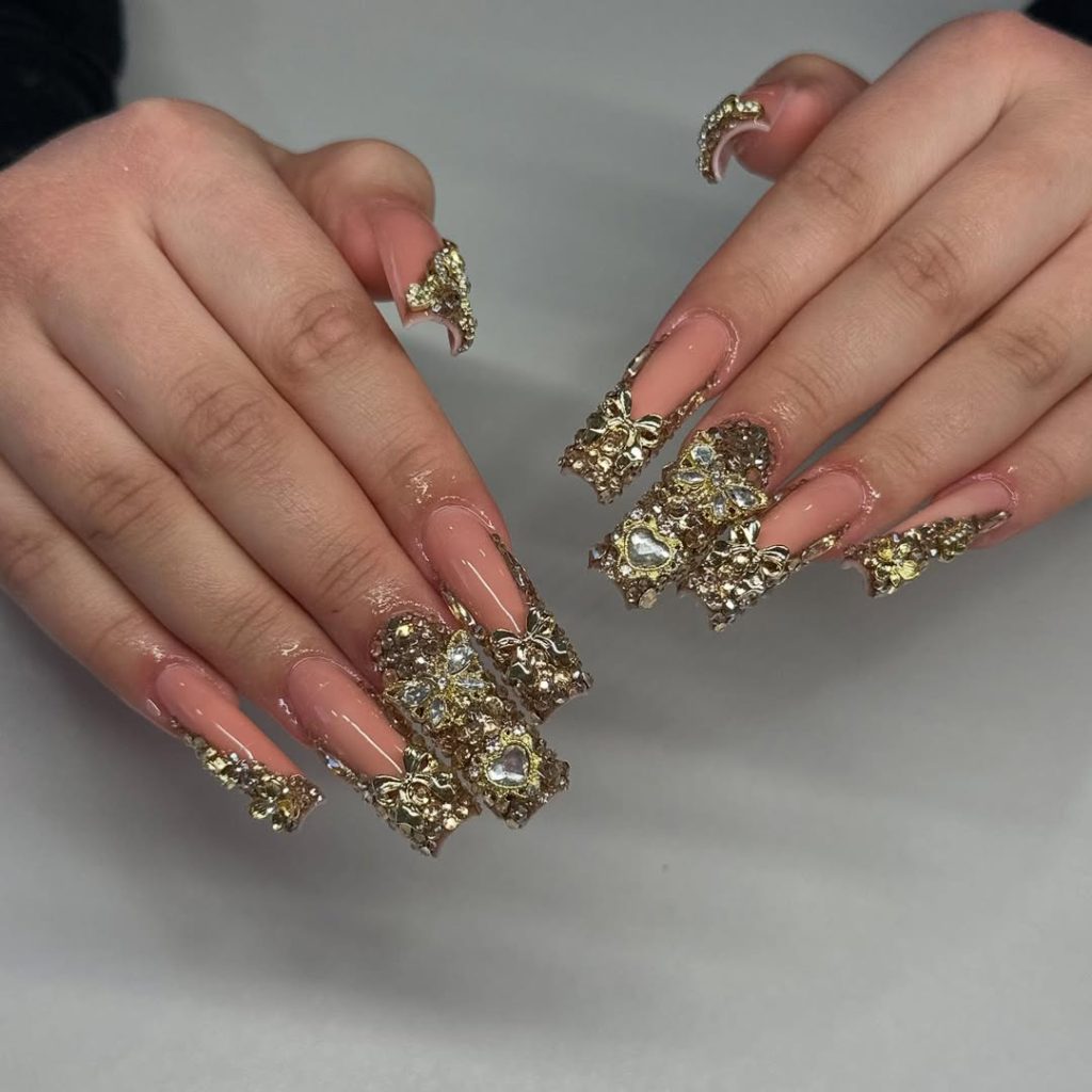 Best suited for women who love long, bold designs, these nails are unapologetically extra. They pair beautifully with cocktail rings or a night-out outfit where you want your hands to be the star. The gold detailing works especially well if you love jewelry-heavy styling, turning the entire look into a cohesive bling masterpiece.