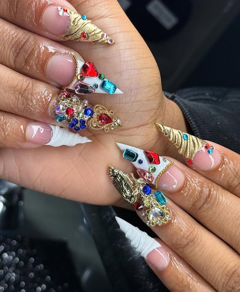 Imagine a treasure chest transformed into nail art — that’s exactly what this design delivers. The combination of red, blue, and green gems with gold accents creates a royal, almost medieval vibe. The white sculpted tips contrast beautifully with the jewel tones, making the entire set look like wearable art.