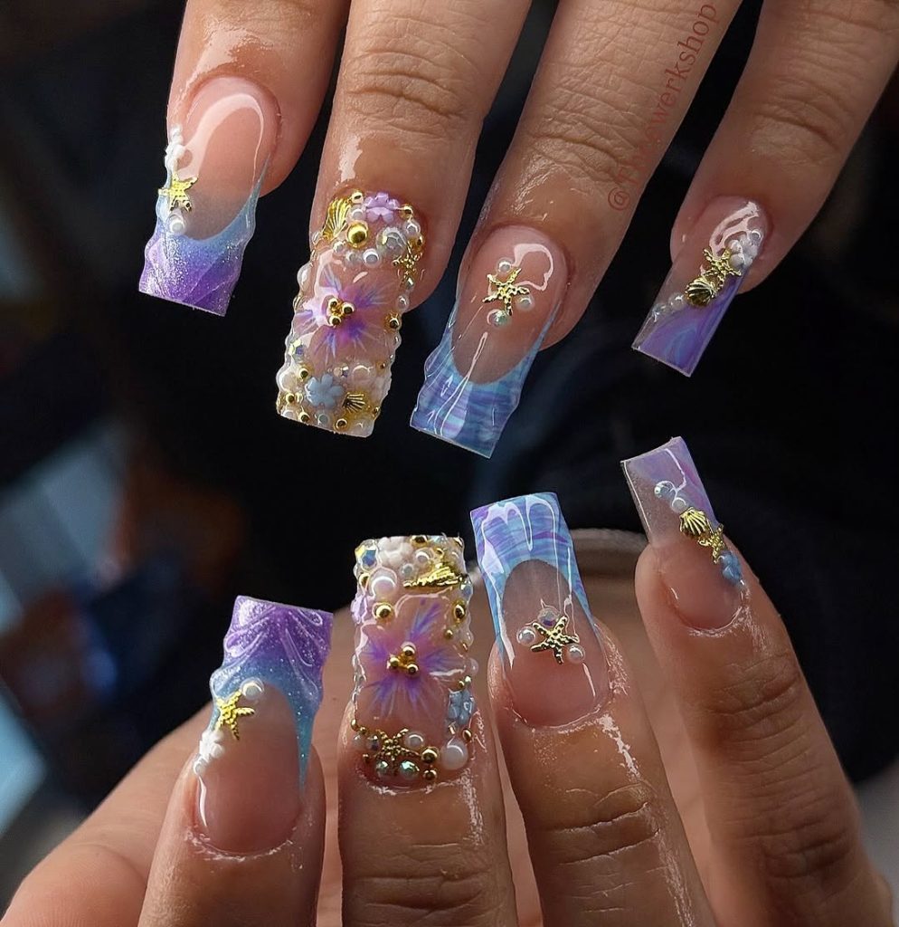 These nails are pure mermaid-core magic. This dreamy combo of purple, blue, and pink sets the mood, while the 3D florals, pearls, and gold sea charms add some enchanting texture. It feels soft, ethereal, and as if you’re floating in a pastel underwater realm.
